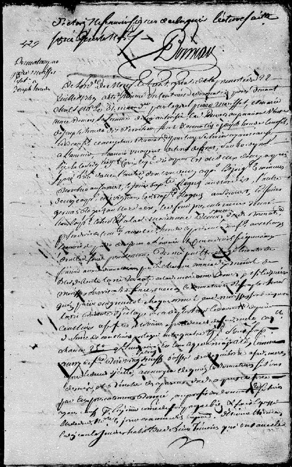 Donation par Pierre Morisset et Marie-Anne Demers, sa femme, auparavant veuve de feu Joseph Houde dit Desrochers; à Joseph Houde (Houde dit Desrochers), leur fils et beau-fils; à savoir un arpent de terre de front sur quarante arpent de profondeur, sis en la seigneurie Sainte-Croix; la présente donation est passée pardevant maître Choret, notaire royal