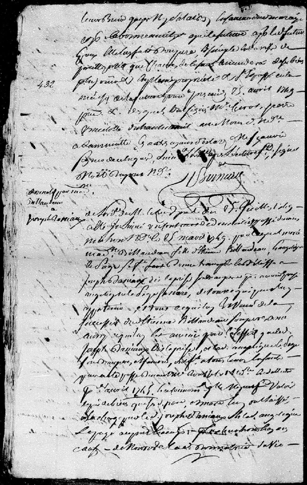 Donation par Marie-Madeleine Billaudeau (Bilodeau), fille d'Étienne Billaudeau (Bilodeau) et d'Angélique Lepage, ses père et mère; à Joseph Daniaux (Daniau) dit Laprise, son beau-père pour avoir épousé ladite Angélique Lesage; à savoir tout ce qui peut appartenir à la donatrice et tout ce qui lui est avenu de la succession de feu Étienne Billaudeau (Bilodeau); la présente donation est passée pardevant maître Michon, notaire