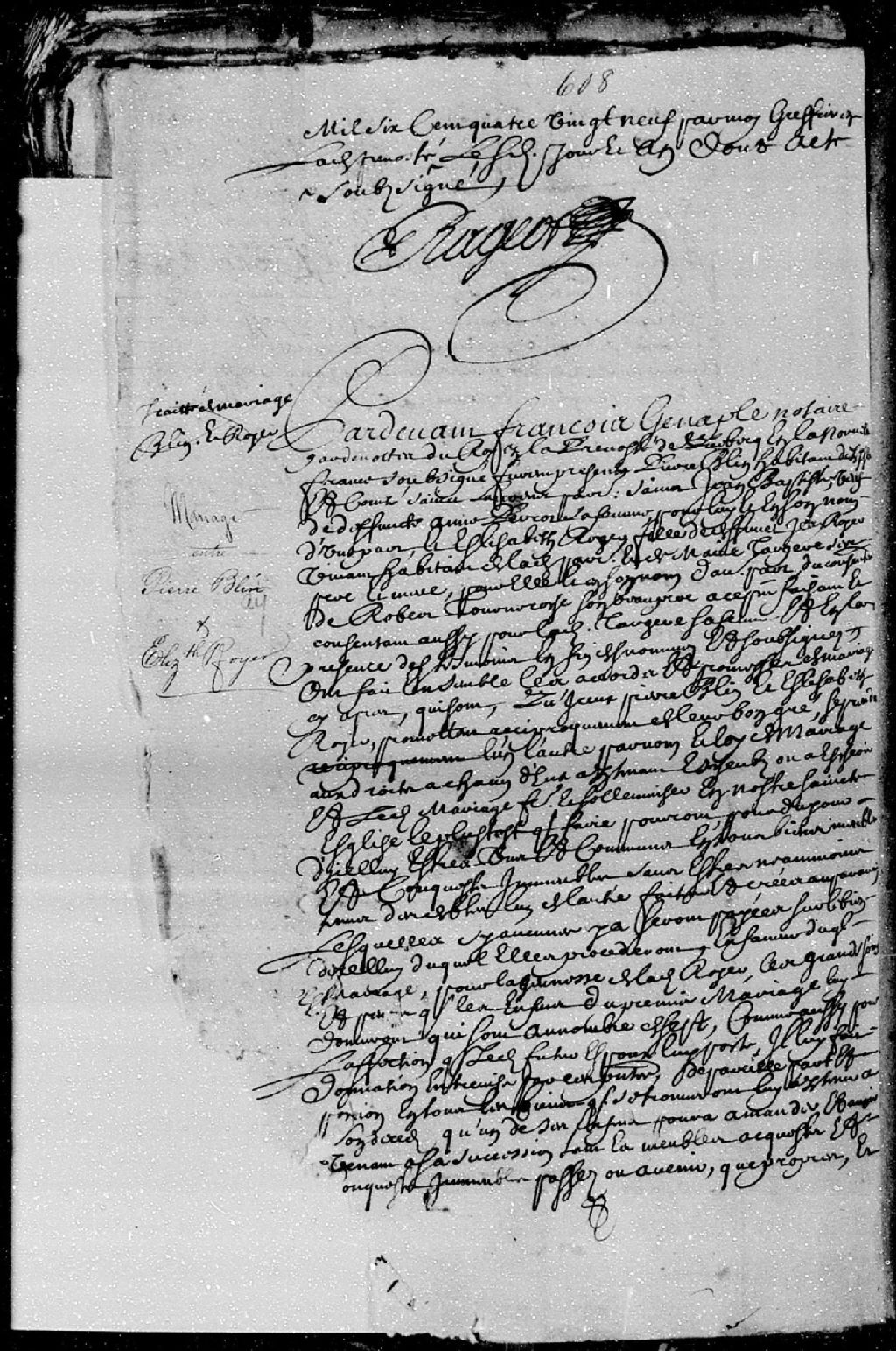 - La pièce se compose d'un mariage entre Pierre Blin (Blais), habitant de l'île et comté de Saint-Laurent en la paroisse Saint-Jean-Baptiste, veuf en première noce de la feue Anne Perrot (Perrault), et Élisabeth Royer, fille du feu Jean Royer et de Marie Targère (Targer), ses père et mère de l'île et comté de Saint-Laurent en la paroisse Saint-Jean-Baptiste, ladite Marie Targère (Targer) est la femme en seconde noce de Robert Tourneroche, Robert de Villeneuve, ingénieur du Roi, et Pierre Nolan, bourgeois de Québec, sont témoins