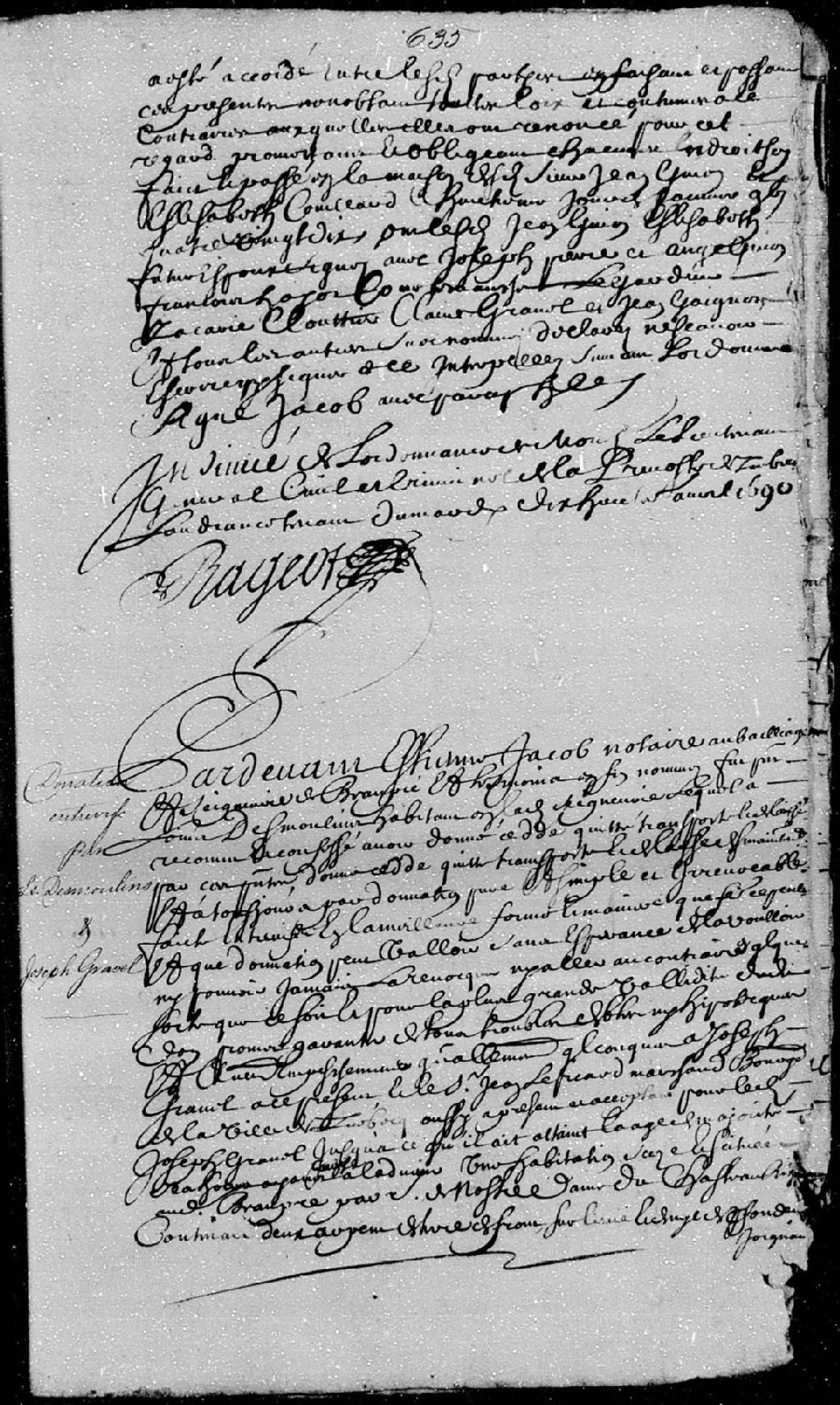 - Le titre complet de la pièce se lit comme suit : Donation par Louis Desmoulins, habitant de la seigneurie de Beaupré, à Joseph Gravel, le sieur Jean LePicard (Picard), marchand bourgeois de Québec, acceptant pour ledit Gravel jusqu'à ce qu'il ait atteint l'âge de la majorité, ladite donation concernant une habitation sise en la seigneurie de Beaupré en la paroisse de Notre-Dame du Château-Richer, description dudit emplacement et maison et noms de voisins, mention aussi de quelques bestiaux, le sieur Antoine Baillon, Pierre Gagnon père, et Charles Gariepy, sont témoins