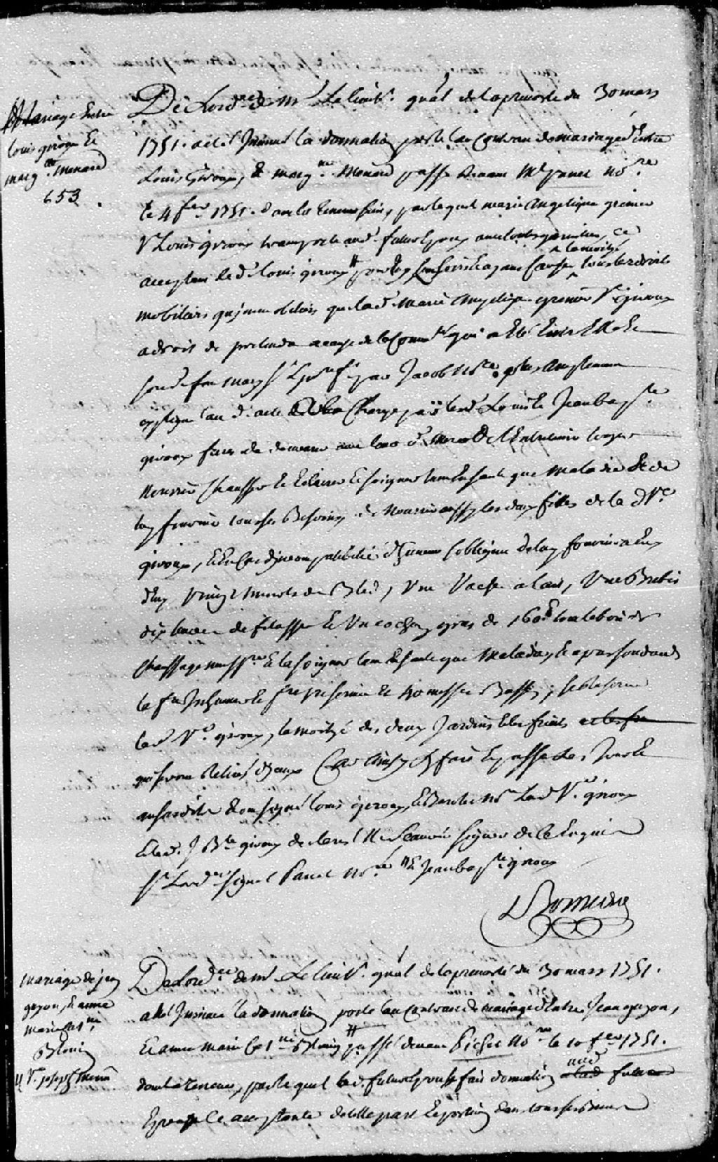 Extrait du contrat de mariage passé pardevant maître Pichet, notaire, entre Jean Guyon et Anne-Marie-Catherine Blouin, veuve de feu Joseph Menu (Meneux dit Châteauneuf), 10 février 1751 [Document insinué le 30 mars 1751], Archives nationales à Québec, Fonds Cour supérieure. District judiciaire de Québec. Insinuations, (03Q,CR301,P3345).