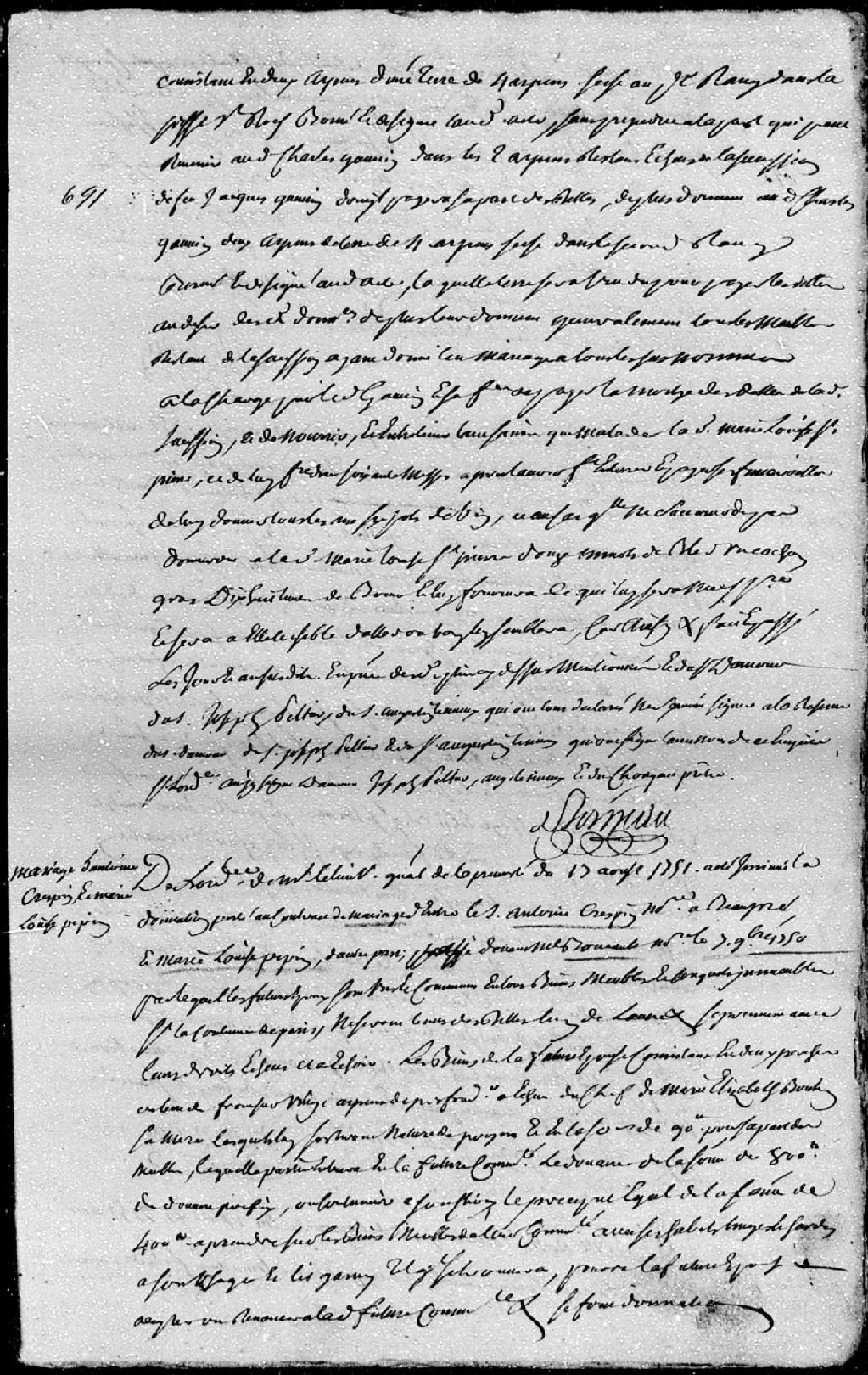 Extrait du contrat de mariage passé pardevant Boucault et Dulaurent, notaires, entre Antoine Crespin, notaire à Beaupré; et Marie-Louise Pepin, fille d'Anne-Élisabeth Boutin, 7 novembre 1750 [Document insinué le 17 août 1751], Archives nationales à Québec, Fonds Cour supérieure. District judiciaire de Québec. Insinuations, (03Q,CR301,P3405).
