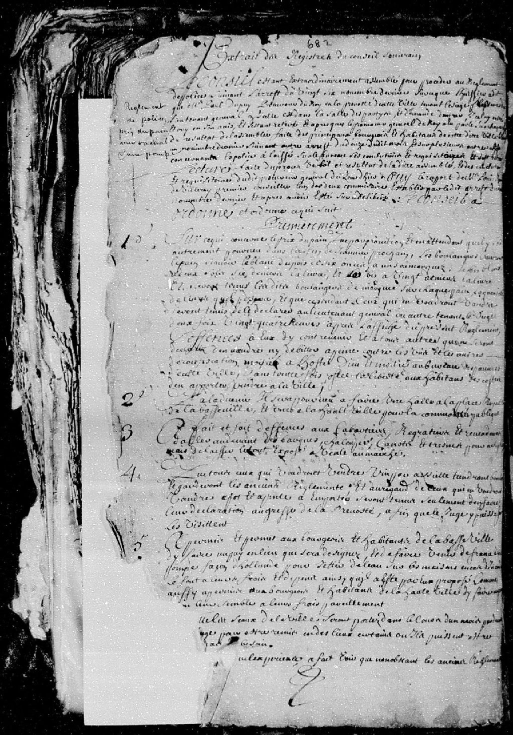 Règlement de police établissant le prix du pain et du vin, ordonnant de faire édifier des haltes à la Haute et à la Basse-Ville pour la commodité publique, ainsi que la construction d'un puit à la Basse-Ville de Québec pour lequel on fera venir une pompe façon d'Hollande pour pouvoir jeter de l'eau sur les maisons en cas d'incendies, mention d'un arrêt en date du 26 novembre 1691, ledit règlement fut lu et affiché le 16 décembre 1691
