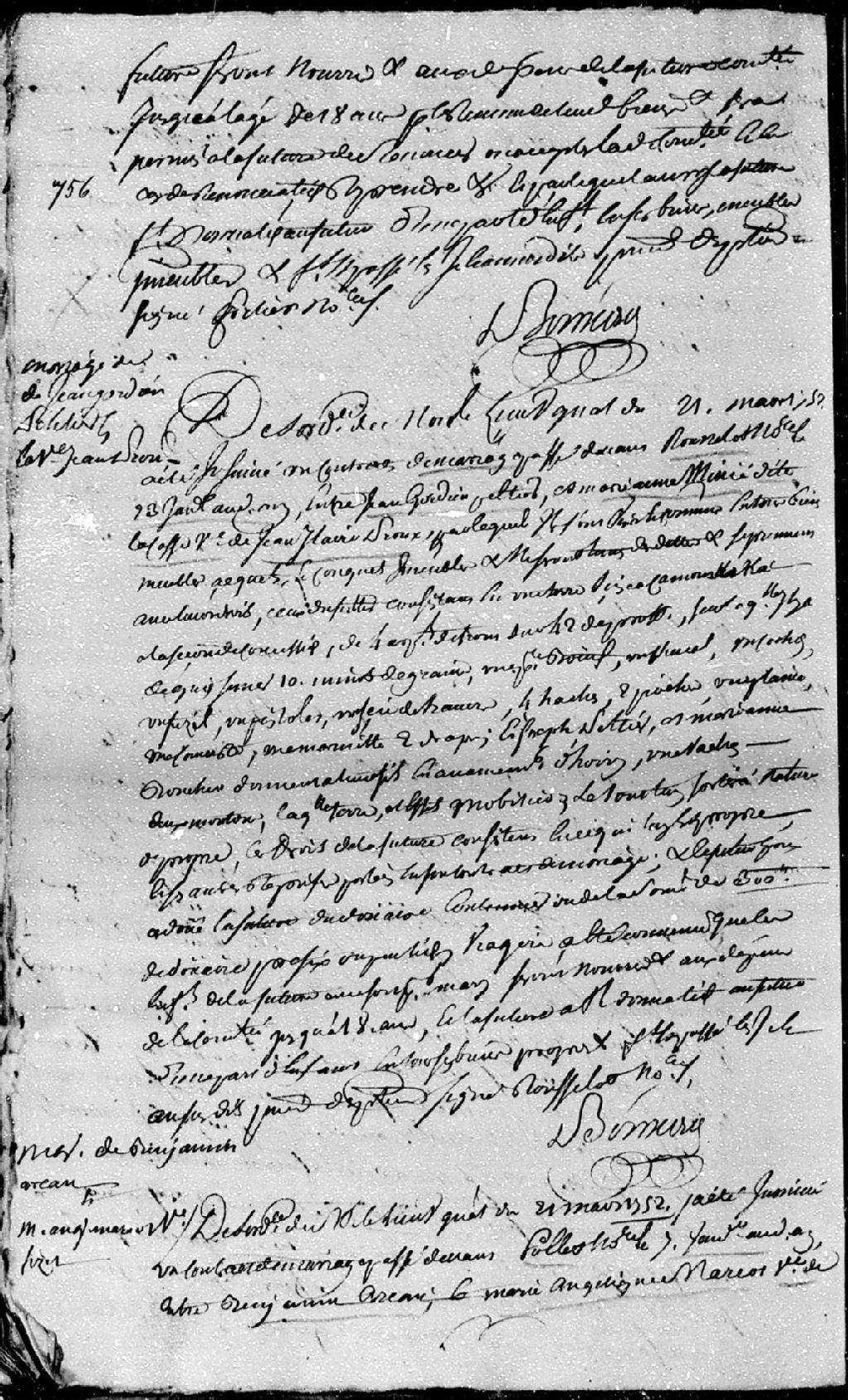 Extrait du contrat de mariage passé pardevant maître Pollet, notaire, entre Benjamin Arcan (Arcand) et Marie-Angélique Marcot, veuve de feu Charles Fizet (Fiset), 7 janvier 1752 [Document insinué le 21 mars 1752], Archives nationales à Québec, Fonds Cour supérieure. District judiciaire de Québec. Insinuations, (03Q,CR301,P3498).