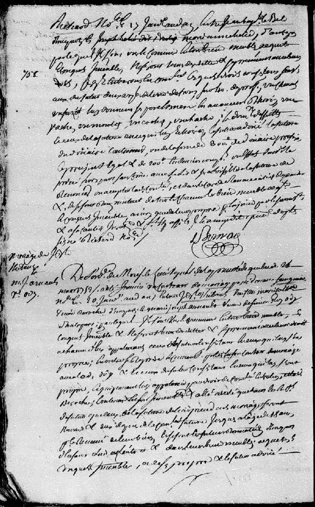 Extrait du contrat de mariage passé pardevant maître Sanguinet, notaire, entre Jean-Baptiste Thibault, veuf de défunte Marie-Catherine Tinon Desroches (Tinon dit Desroches); et Marie-Josèphe Arnoult (Arnould), veuve de feu Simon Roy-Ody (Roy dit Audy), 20 janvier 1752 [Document insinué le 24 mars 1752], Archives nationales à Québec, Fonds Cour supérieure. District judiciaire de Québec. Insinuations, (03Q,CR301,P3502).