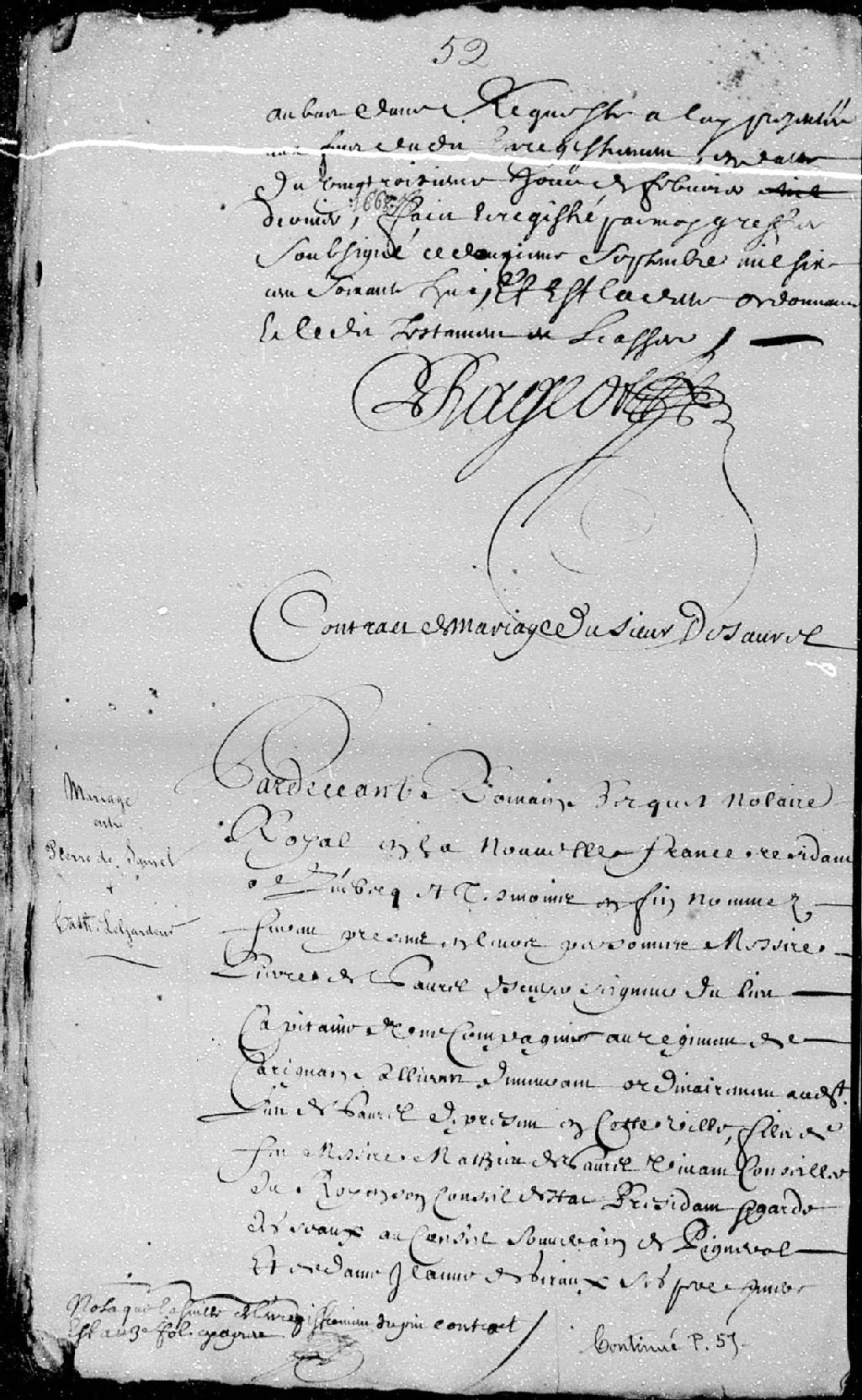 - Le titre complet de la pièce se lit comme suit : Mariage entre Pierre de Saurel (Sorel), écuyer, seigneur de Sorel, capitaine d'une compagnie au régiment de Carignan-Sallière, demeurant ordinairement à Sorel, de présent à Québec, fils du feu messire Mathieu de Saurel (Sorel), de son vivant conseiller du Roi en son Conseil d'état, président et garde des sceaux du Conseil Souverain de Pigenrol, et dame Jeanne de Giraud, ses pères et mères, et Catherine LeGardeur, fille de Charles LeGardeur, écuyer et seigneur de Tilly, conseiller du Roi au Conseil, et demoiselle Geneviève Juchereau, ses père et mère, sont présent messire Daniel de Rémy, chevalier, seigneur et Baron de Courcelle, gouverneur et lieutenant général des armées de Sa Majesté en Nouvelle-France, François de Laval, évêque de Pétrée, vicaire apostolique de la Nouvelle-France, messire Jean Talon, conseiller du Roi en ses Conseils d'état et privé, intendant de justice, police et finance au Canada, monsieur de Boutroue, aussi intendant, monsieur ?, colonel de régiment et Charles Aubert de LaChenaye (Chesnaye - LaChesnaie - LaChesnaye), marchand bourgeois de Québec, amis du futur époux, et aussi Paul-Noël LeGardeur, écuyer, Marie LeGardeur, frère et s¿ur de la future épouse, Jean Juchereau, sieur De Maure (Des Maures - Desmaures), parent maternel, Marie Favery, veuve du feu sieur Pierre LeGardeur, de son vivant écuyer, sieur de Repentigny, sa tante, les sieurs de Repentigny, de la Vallée (Lavallée), et Duponceaux, frères, ses cousins, Jacques LeNeuf, écuyer, sieur de la Potterie (Poterie - LaPoterie), Pierre Denis, sieur de la Ronde (LaRonde), et demoiselle Marie Chartier, tous parents et amis de ladite future épouse