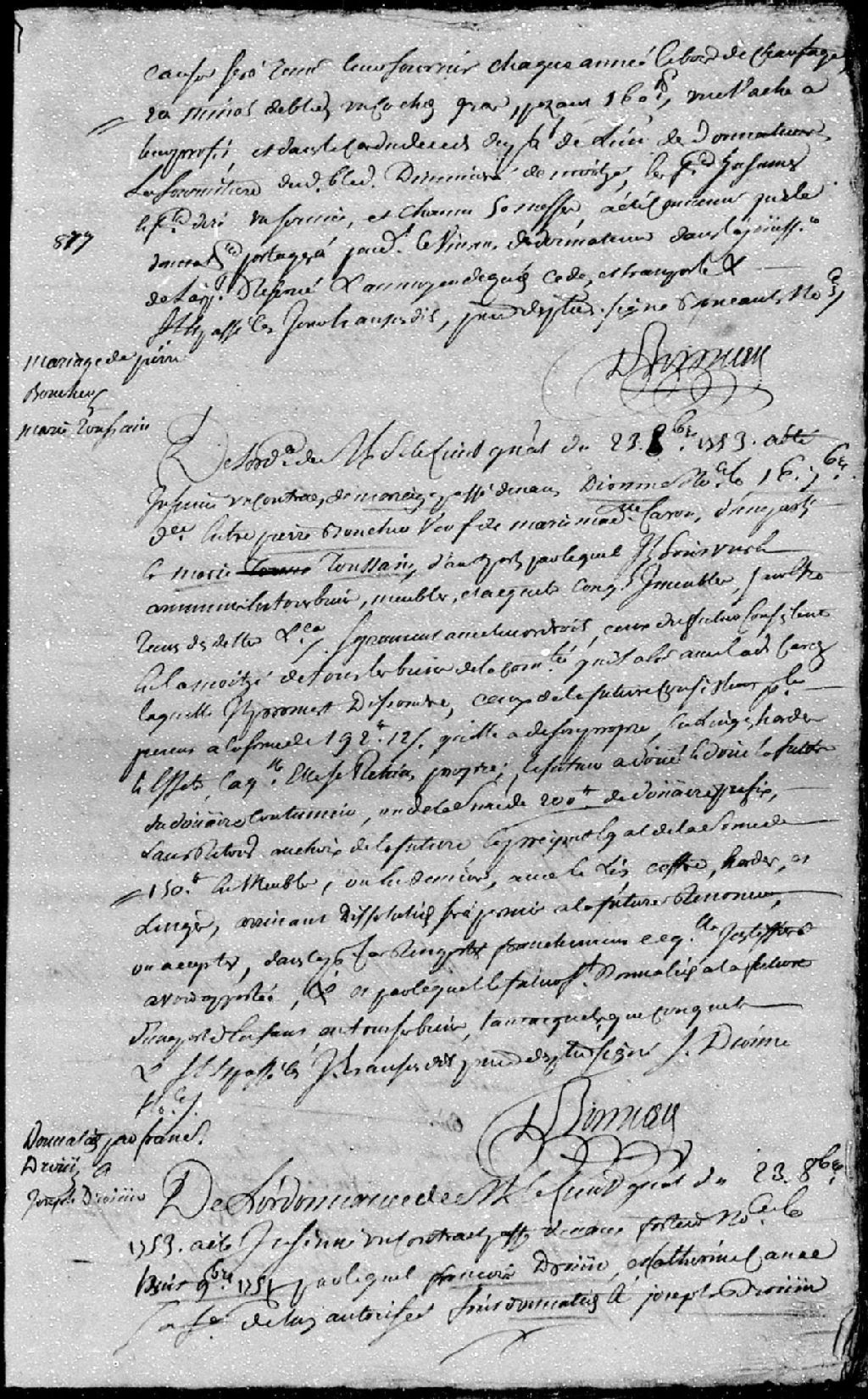 Extrait du contrat de mariage passé pardevant maître Dionne, notaire, entre Pierre Boucher, veuf de feue Marie-Madeleine Caron; et Marie Toussain (Toussaint)