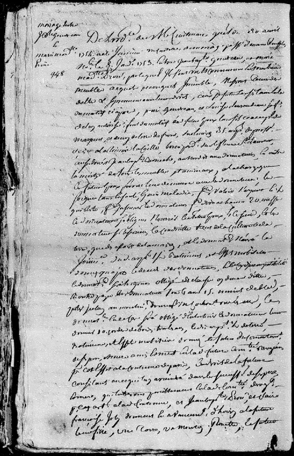 Extrait du contrat de mariage passé pardevant maître Rousselot, notaire, entre Jean-Baptiste Gendreau, fils de Pierre Gendreau et de Louise Laurendeau (Rollandeau), ses père et mère; et Marie-Madeleine Prou (Proux - Proulx), fille de Jean-Baptiste Proux (Proulx - Prou) et Claire-Françoise Joly, ses père et mère, 8 janvier 1753 [Document insinué le 30 avril 1754], Archives nationales à Québec, Fonds Cour supérieure. District judiciaire de Québec. Insinuations, (03Q,CR301,P3781).