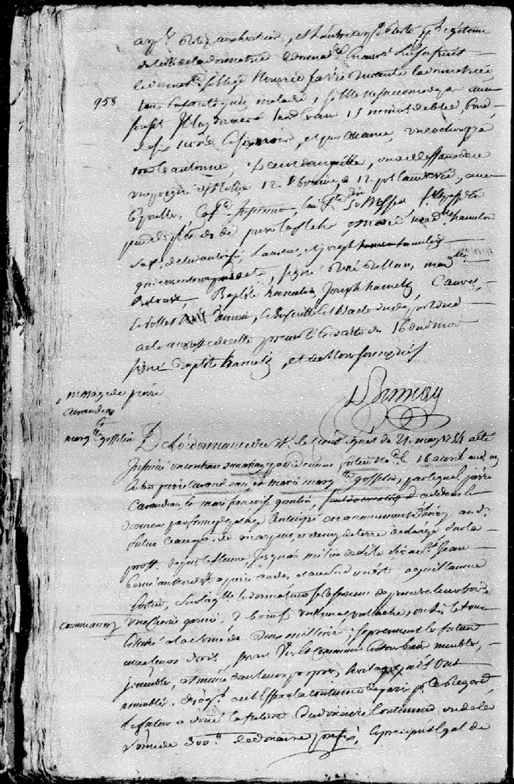 Extrait du contrat de mariage passé pardevant maître Fortier, notaire, entre Pierre Curodeau, fils de Pierre Curodeau, époux en secondes noces de Marie-Françoise Gosselin; et Marie-Marguerite Gosselin, 16 avril 1754 [Document insinué le 21 mai 1754], Archives nationales à Québec, Fonds Cour supérieure. District judiciaire de Québec. Insinuations, (03Q,CR301,P3797).