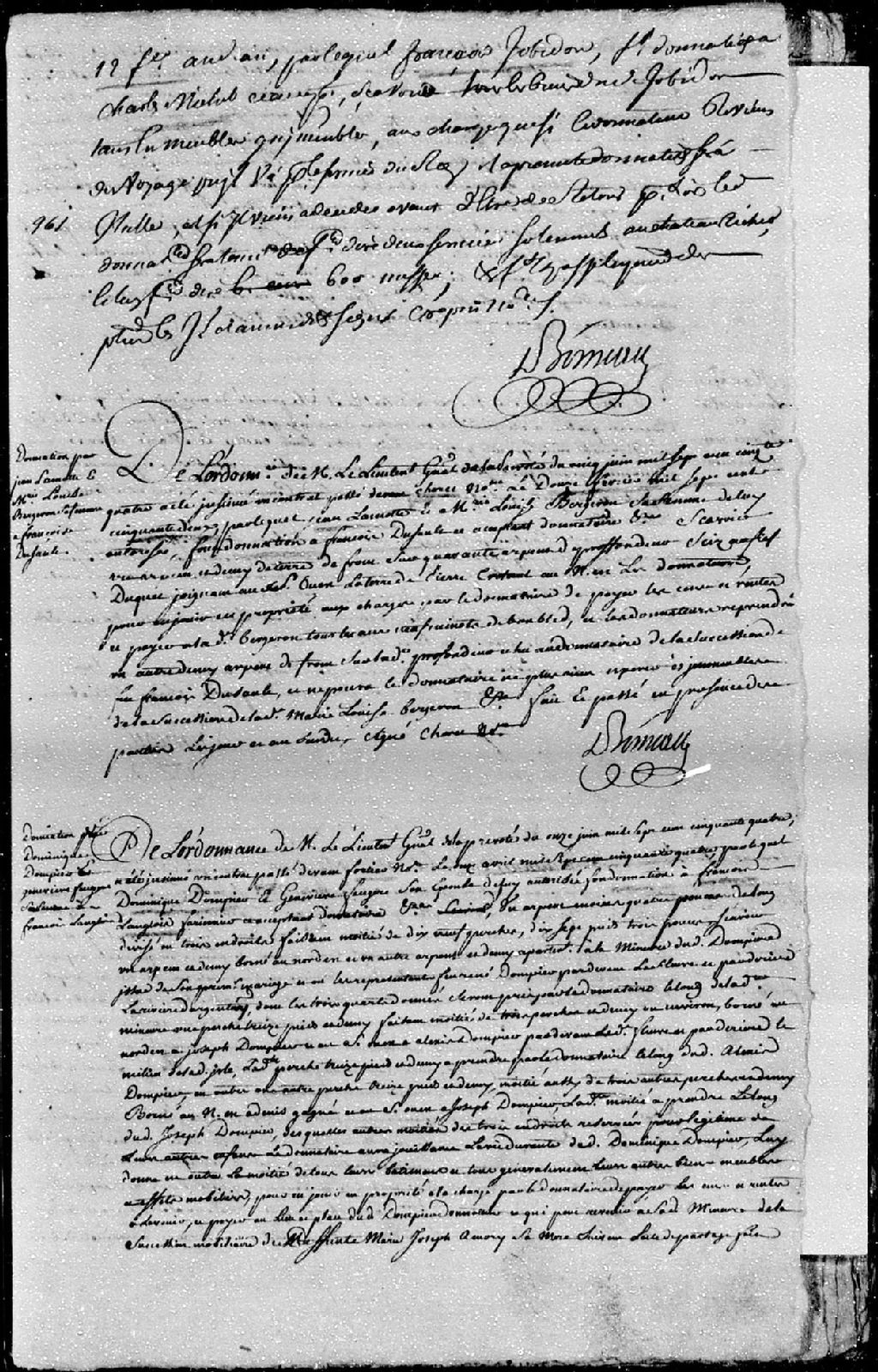 Donation par Jean Lamotte (Lamothe) et Marie-Louise Bergeron, mari et femme; à François Dusault (Dussault); à savoir un arpent et demi de terre de front sur quarante arpents de profondeur sis au fief Duquet; la présente donation est passée pardevant maître Choret, notaire