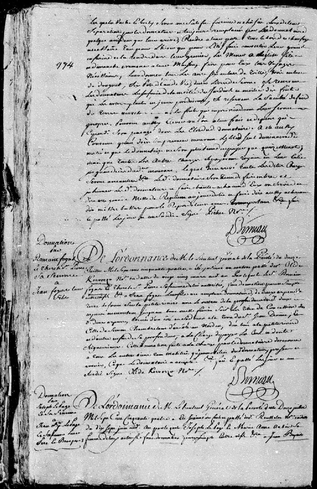 Donation par Romain (Raymond) Fogas (de Phocas) et Thérèse Saint-Pierre, mari et femme; à Jean Fogas (de Phocas), leur fils; à savoir une terre de deux arpents de front sise sur la Petite-Rivière, à charge du donataire de payer les cens et droits seigneuriaux dont la terre est chargée; la présente donation est passée pardevant maître Kerverzo (Kerverso), notaire