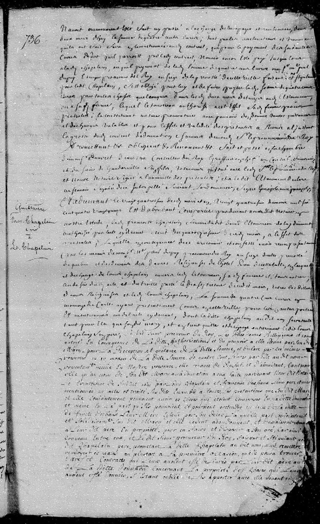 Quittance donnée par Françoise Chapelain, femme de David Létourneau, au sieur Louis Chapelain, son père, suite à la réception d'une somme de 400 livres par les mains de Paul Dupuis, procureur du Roi au siège de la Prévôté de Québec, et des Dames Religieuses de l'Hôtel-Dieu de Québec en l'acquit et décharge dudit Louis Chapelain; cette quittance vient officialiser un acte de renonciation d'une donation faite audit Létourneau et à sa femme, par Louis Chapelain et feue Françoise Dechaux