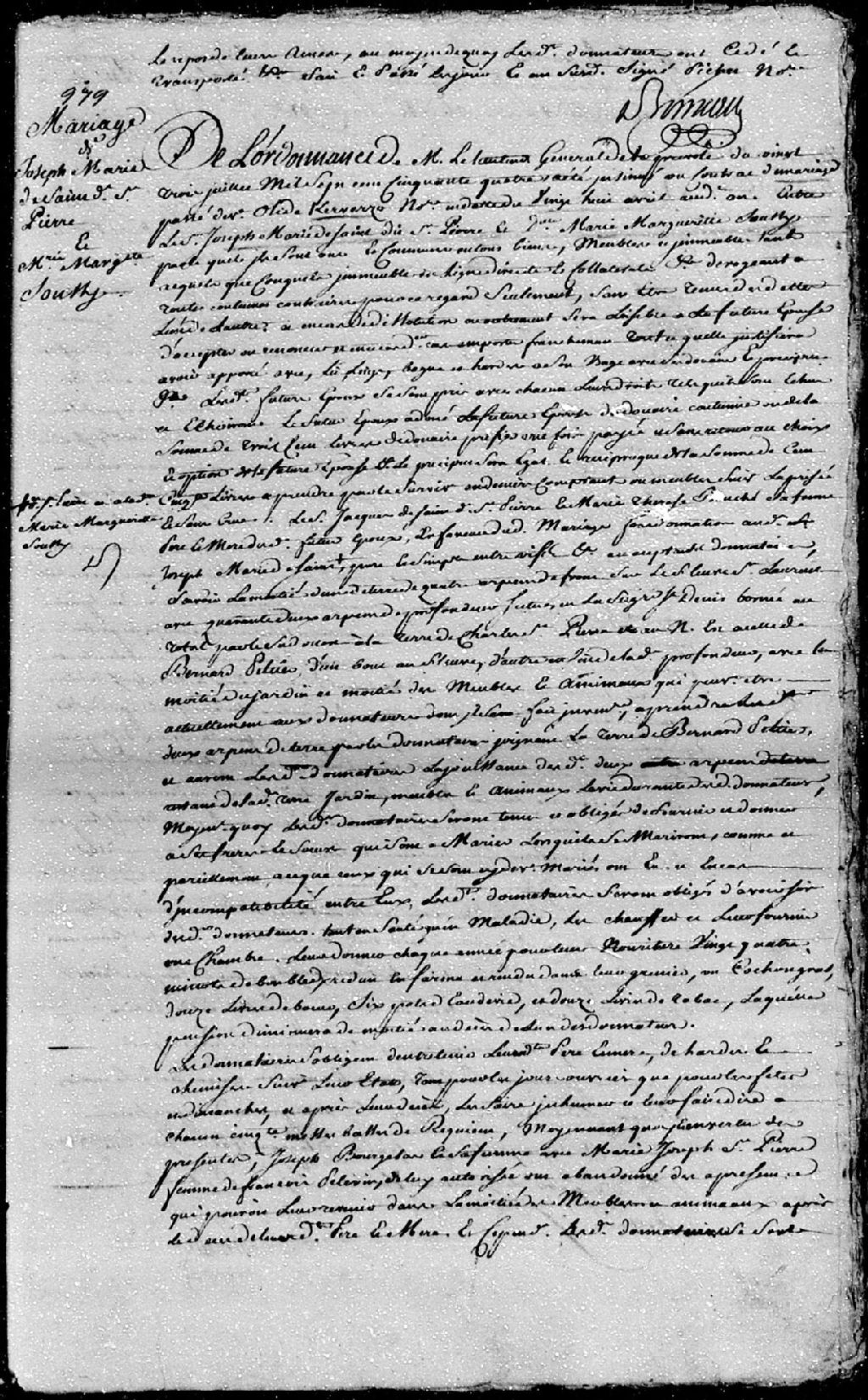 Extrait du contrat de mariage passé pardevant maître Kerverzo (Kerverso), notaire, entre Joseph-Marie Dessaint dit St-Pierre (Saint-Pierre), fils de Jacques DeSaint dit St-Pierre (Saint-Pierre) et Marie-Thérèse Bouché (Boucher), ses père et mère; et Marie-Marguerite Soussy (Soucy dit Lavigne)