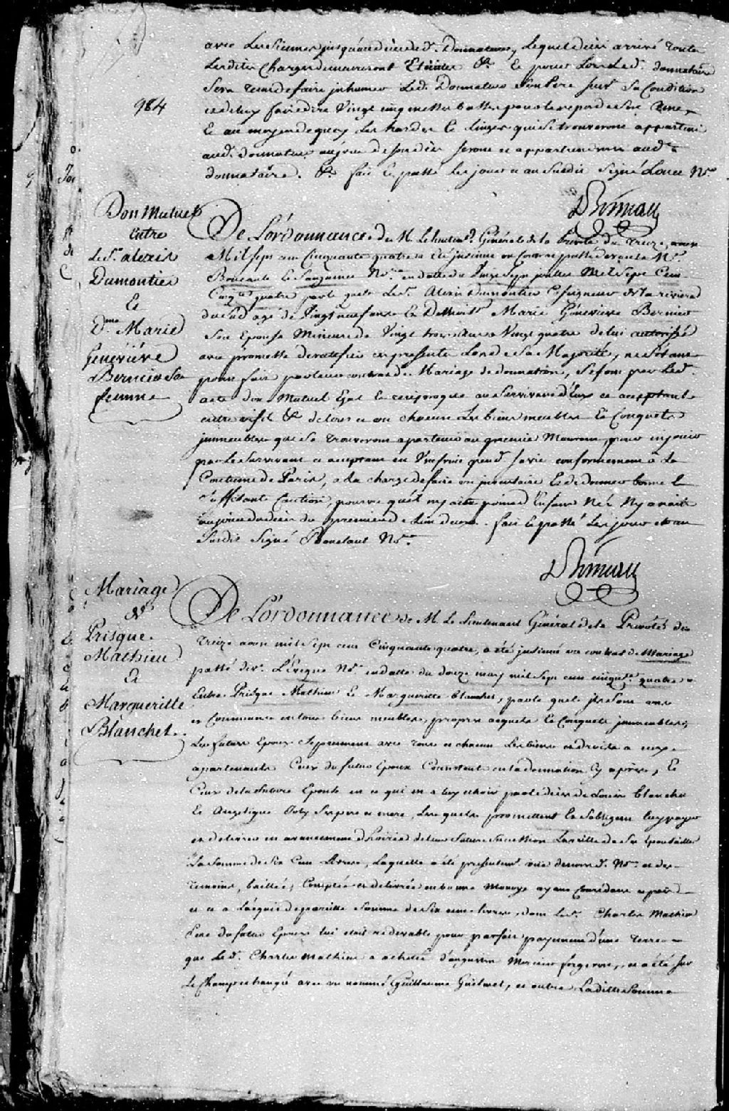 Extrait du contrat de mariage passé pardevant maître Lévesque, notaire, entre Prisque Mathieu, fils de Charles Mathieu et Marie-Thérèse Dufresne, ses père et mère; et Marguerite Blanchet, fille de Louis Blanchet et Angélique Joly, ses père et mère, 12 mai 1754 [Document insinué le 13 août 1754], Archives nationales à Québec, Fonds Cour supérieure. District judiciaire de Québec. Insinuations, (03Q,CR301,P3831).