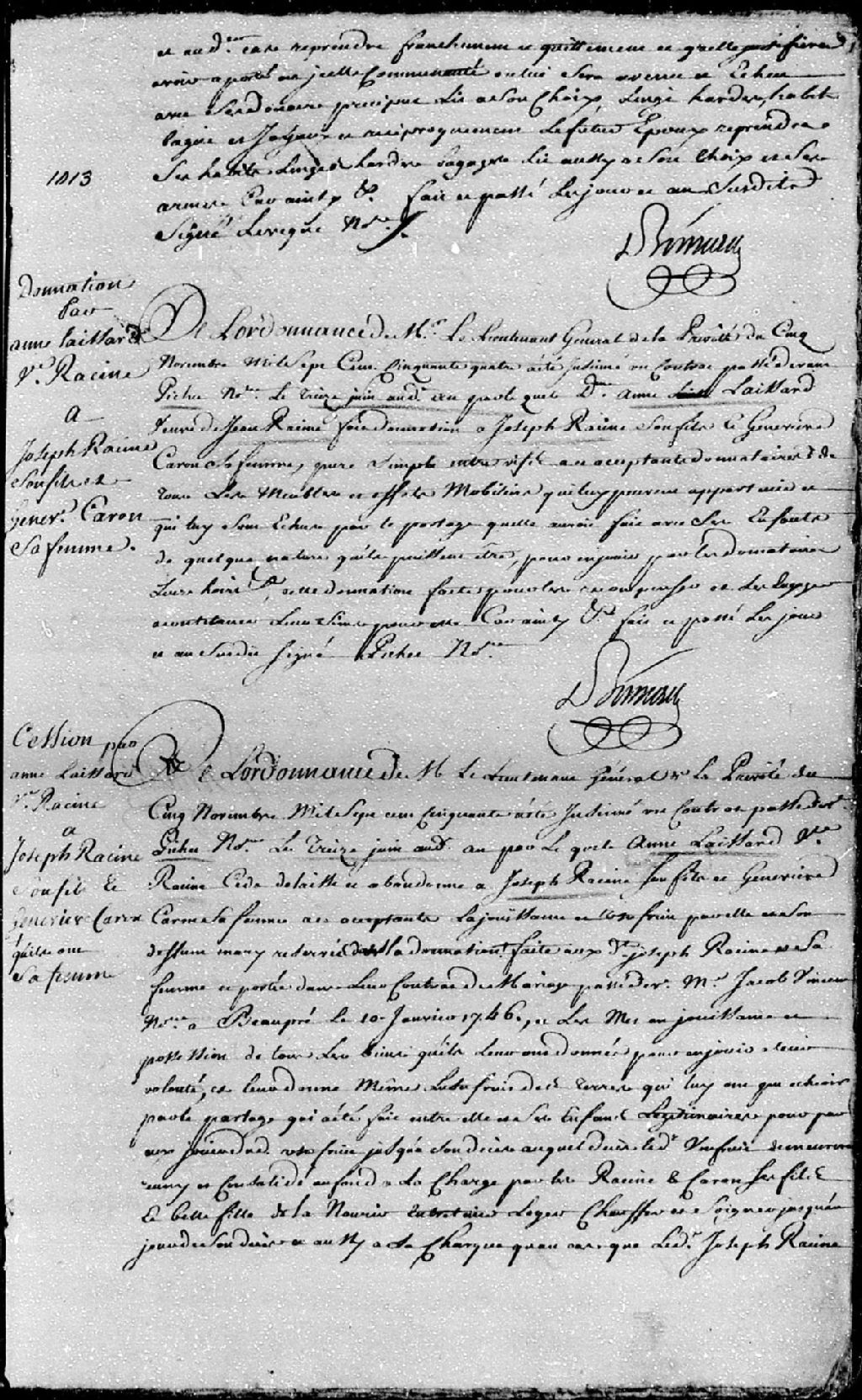 Donation par Anne Laissard (Lessard), veuve de feu Jean Racine; à Joseph Racine, son fils, et Geneviève Caron, sa femme; à savoir tous les meubles et effets mobiliers pouvant appartenir à la donatrice; le présent acte de donation et cession est passé pardevant maître Pichet, notaire