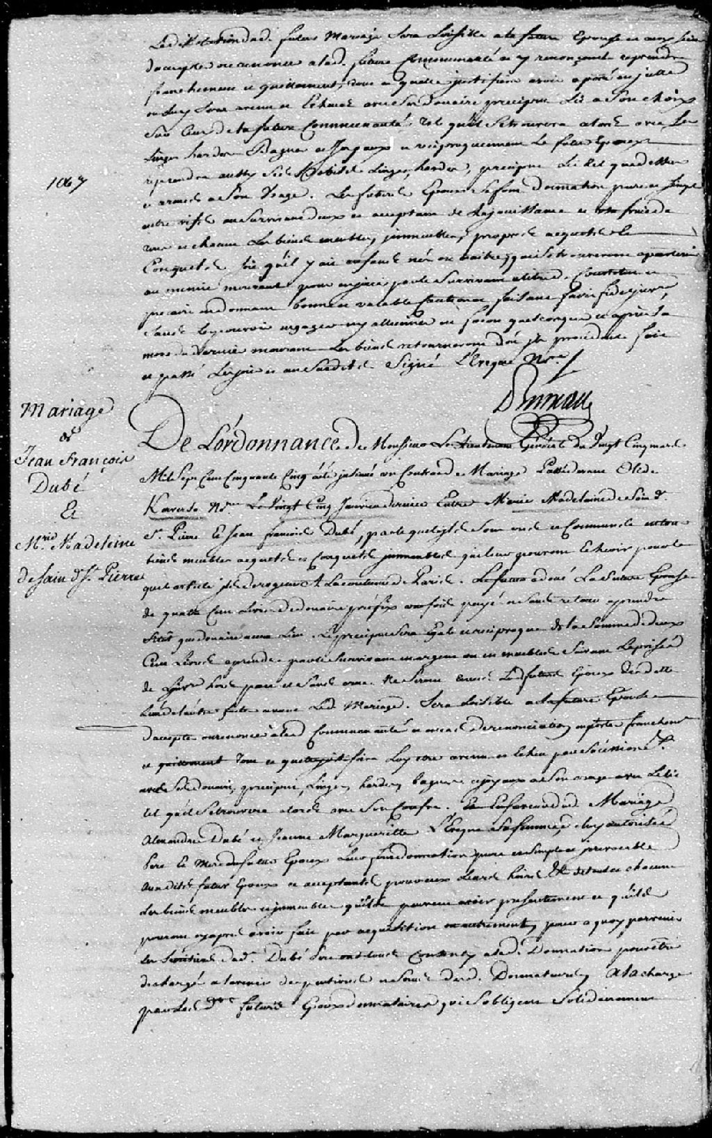 Extrait du contrat de mariage passé pardevant maître Kerverzo (Kerverso), notaire, entre Jean-François Dubé, fils d'Alexandre Dubé et de Jeanne-Marguerite Léveque (Lévesque), ses père et mère; et Marie-Madeleine Dessaint dit St-Pierre (Saint-Pierre), fille d'Alexandre Desaint dit Saint-Pierre (Saint-Pierre), son père