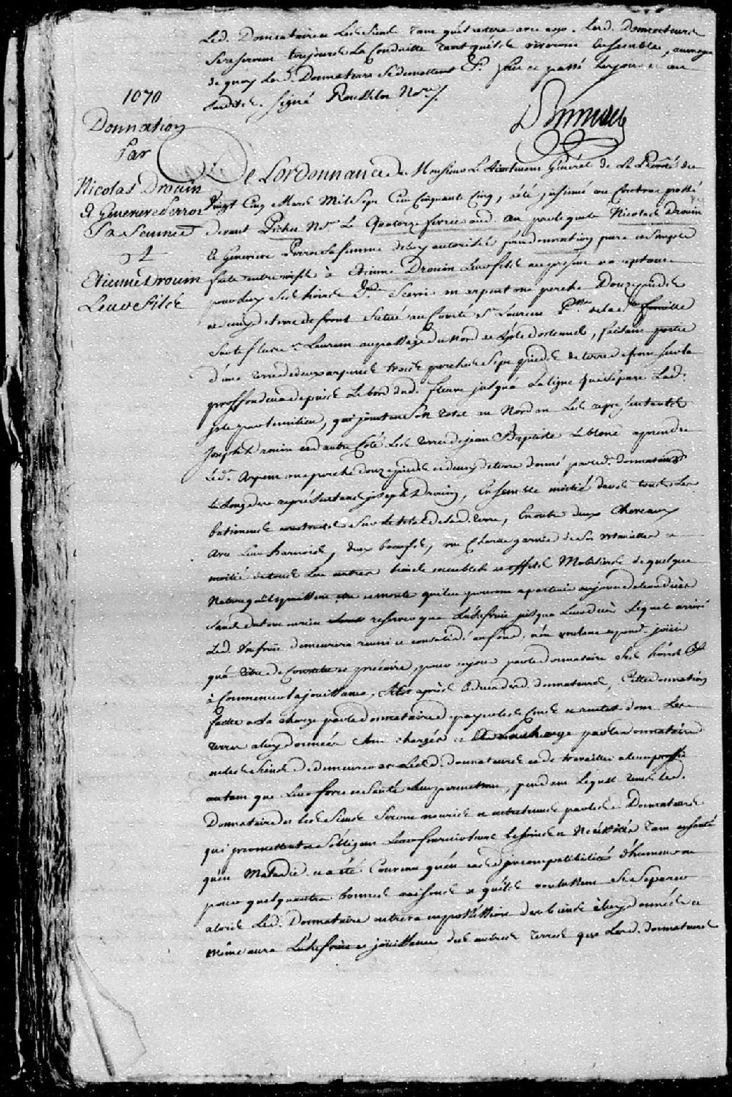 Donation par Nicolas Drouin et Geneviève Perrot (Perrault), mari et femme; à Étienne Drouin, leur fils; à savoir une portion de terre sise au comté Saint-Laurent (île d'Orléans), paroisse de la Sainte-Famille..., 14 février 1755 [Document insinué le 25 mars 1755], Archives nationales à Québec, Fonds Cour supérieure. District judiciaire de Québec. Insinuations, (03Q,CR301,P3909).