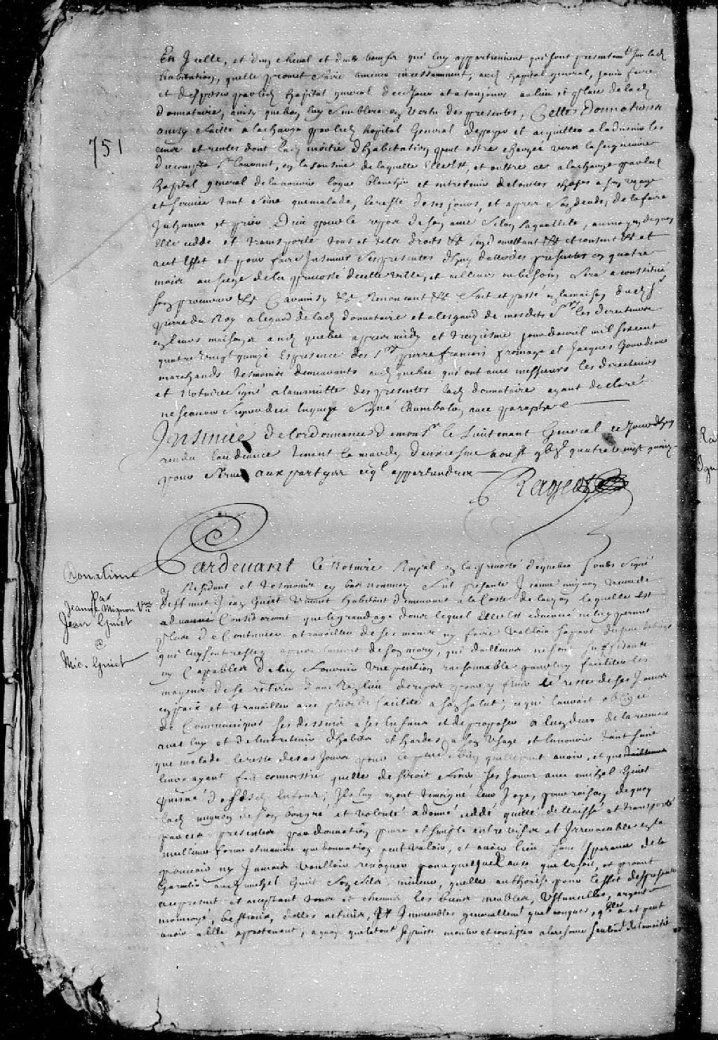 Donation par Jeanne Mignon, veuve de feu Jean Guyet (Guay), vivant habitant demeurant en la côte de Lauzon, de tous ses biens meubles, ustensiles, argent, monnaie, bestiaux, dettes et immeubles, à Michel Guyet (Guay), son fils mineur; ladite donation est passée pardevant Chambalon, notaire royal en la Prévôté de Québec, en présence des sieurs Charles Rageot, greffier de cette Prévôté, et d'Antoine Fauvel, marchand, témoins