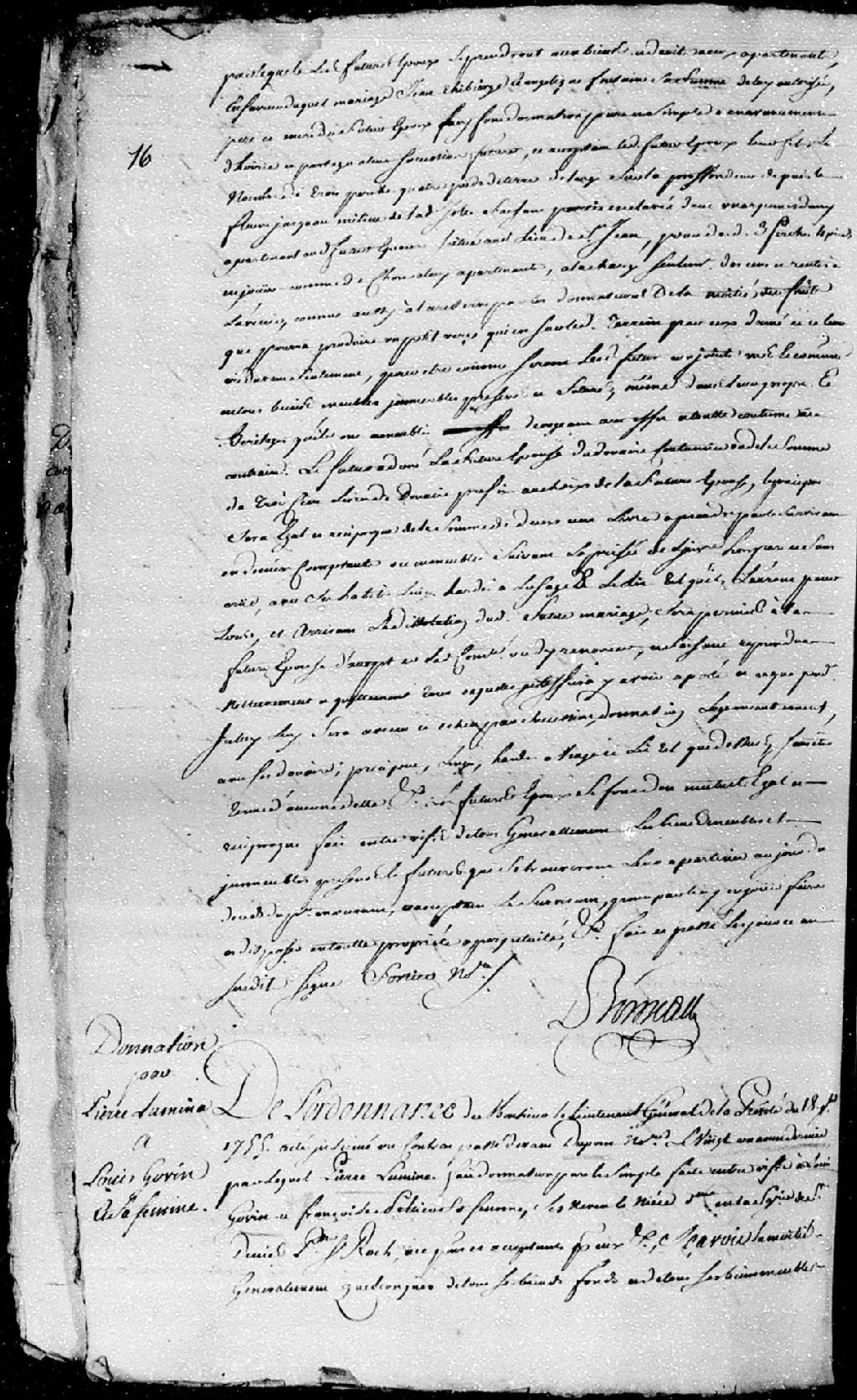 Donation par Pierre Lumina (Lumineau); à Louis Govin (Gauvin) et Françoise Peltier (Pelletier), mari et femme, neveu et nièce du donateur, demeurant en la seigneurie Saint-Denis (seigneurie de Saint-Roch-des-Aulnaies), paroisse Saint-Roch; à savoir la moitié généralement quelconque de tous les biens fonds et de tous les biens meubles pouvant appartenir au donateur; la présente donation est passée pardevant maître Dupont, notaire