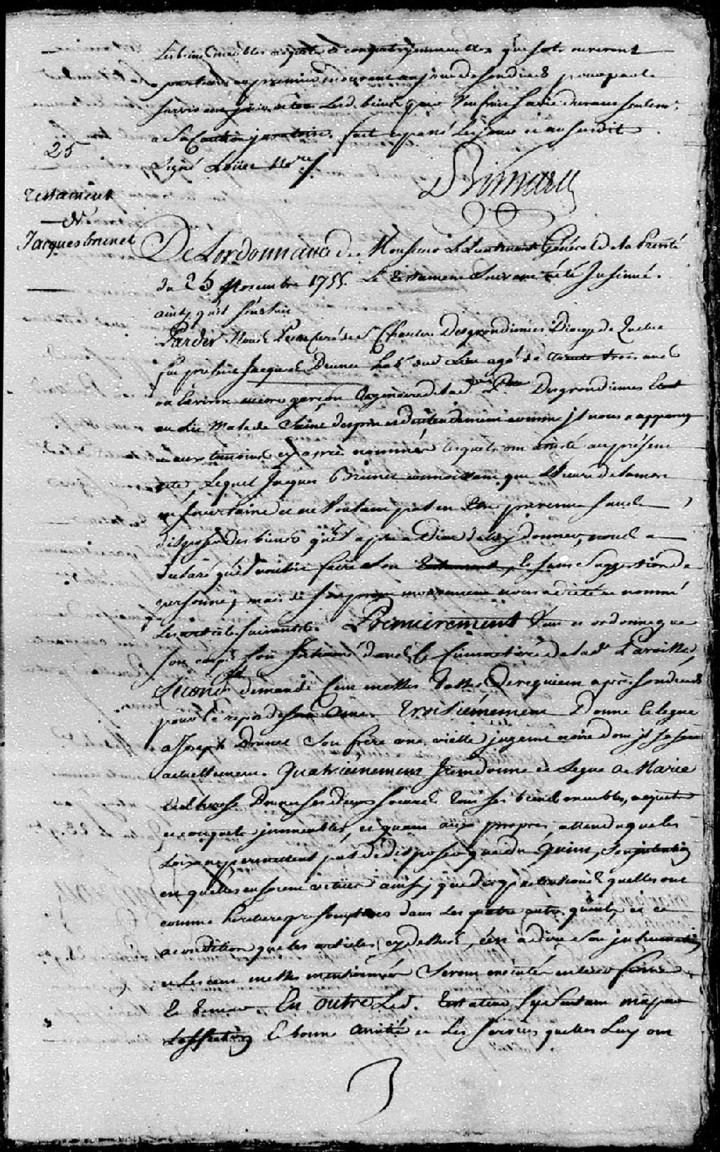 Testament de Jacques Brunet, habitant des Grondines, âgé de trente-trois ans, encore garçon (célibataire), alité et malade mais sain d'esprit et d'entendement; fait et passé sous seing privé en présence du prêtre Hingan, curé de Saint-Charles-des-Grondines, Diocèse de Québec; ledit testament est déposé au greffe de la Prévôté de Québec le 23 novembre 1755