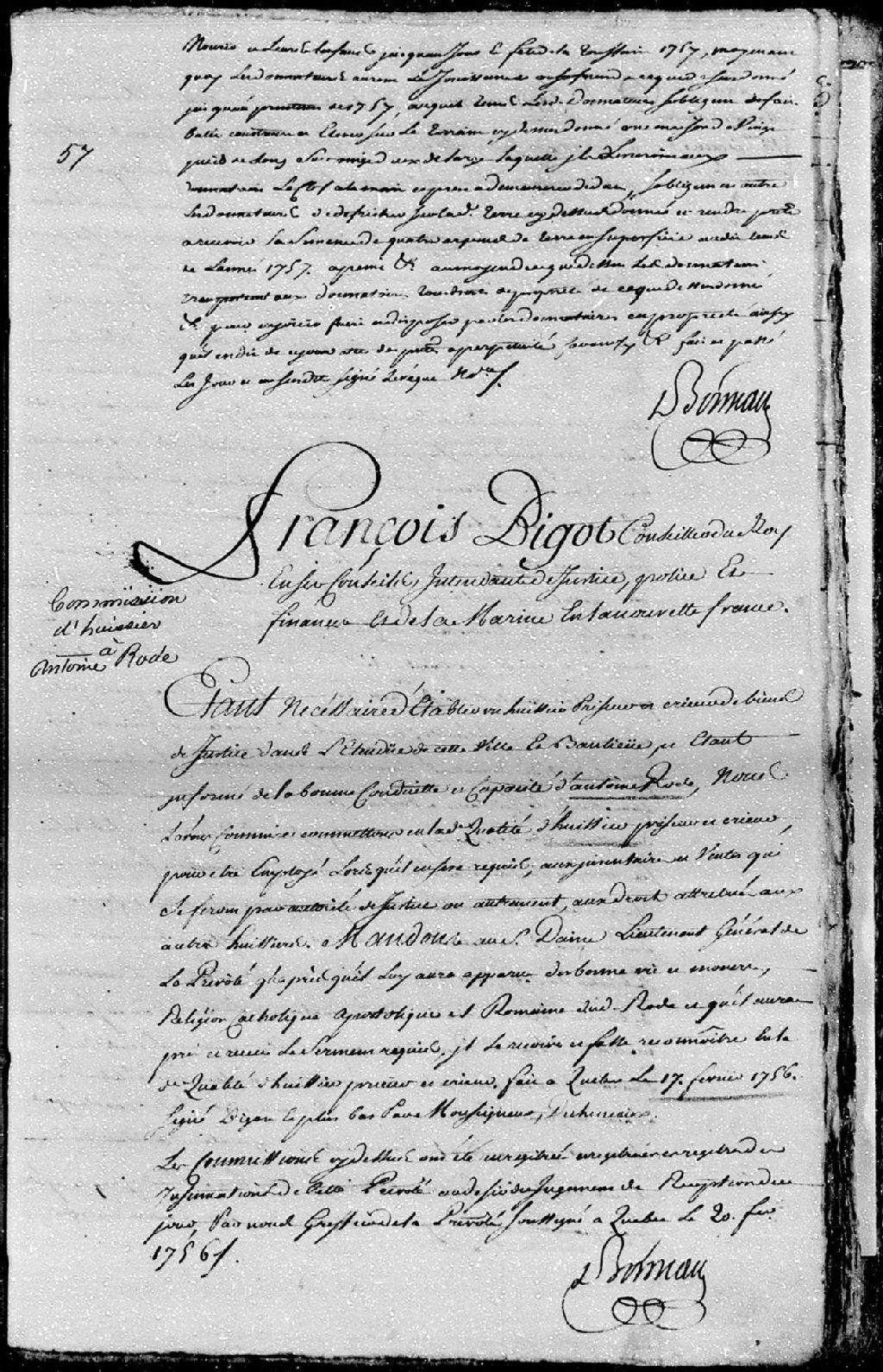 Commission d'huissier priseur et crieur de biens de Justice accordée à Antoine Rode (Rodé), par François Bigot, conseiller du Roi en ses conseils, Intendant de Justice, Police, Finances et de la Marine en toute la Nouvelle-France, 17 février 1756 [Document insinué le 20 février 1756], Archives nationales à Québec, Fonds Cour supérieure. District judiciaire de Québec. Insinuations, (03Q,CR301,P4021).