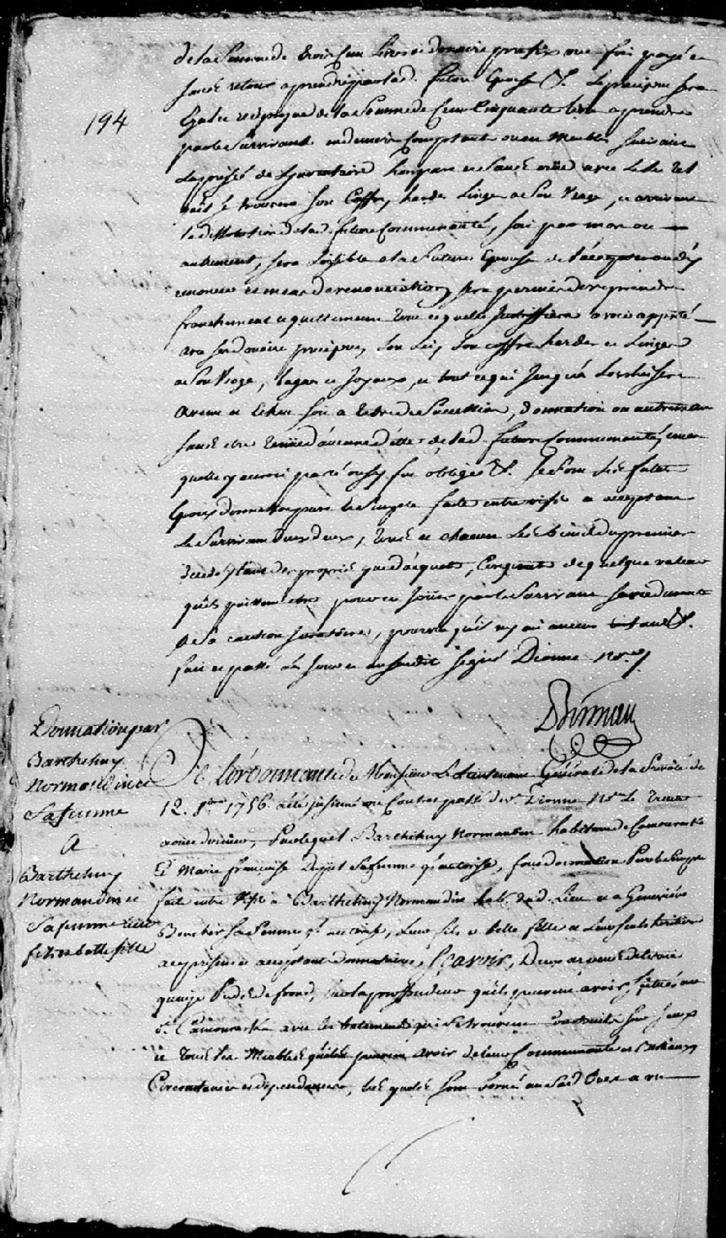 - Donation par Barthélemi Normandin (dit Lajoie), habitant de Kamouraska, et Marie-Françoise Dupil, mari et femme; à Barthélemi Normandin, habitant dudit lieu, et Geneviève Boucher, leurs fils et belle-fille; à savoir une portion de terre...