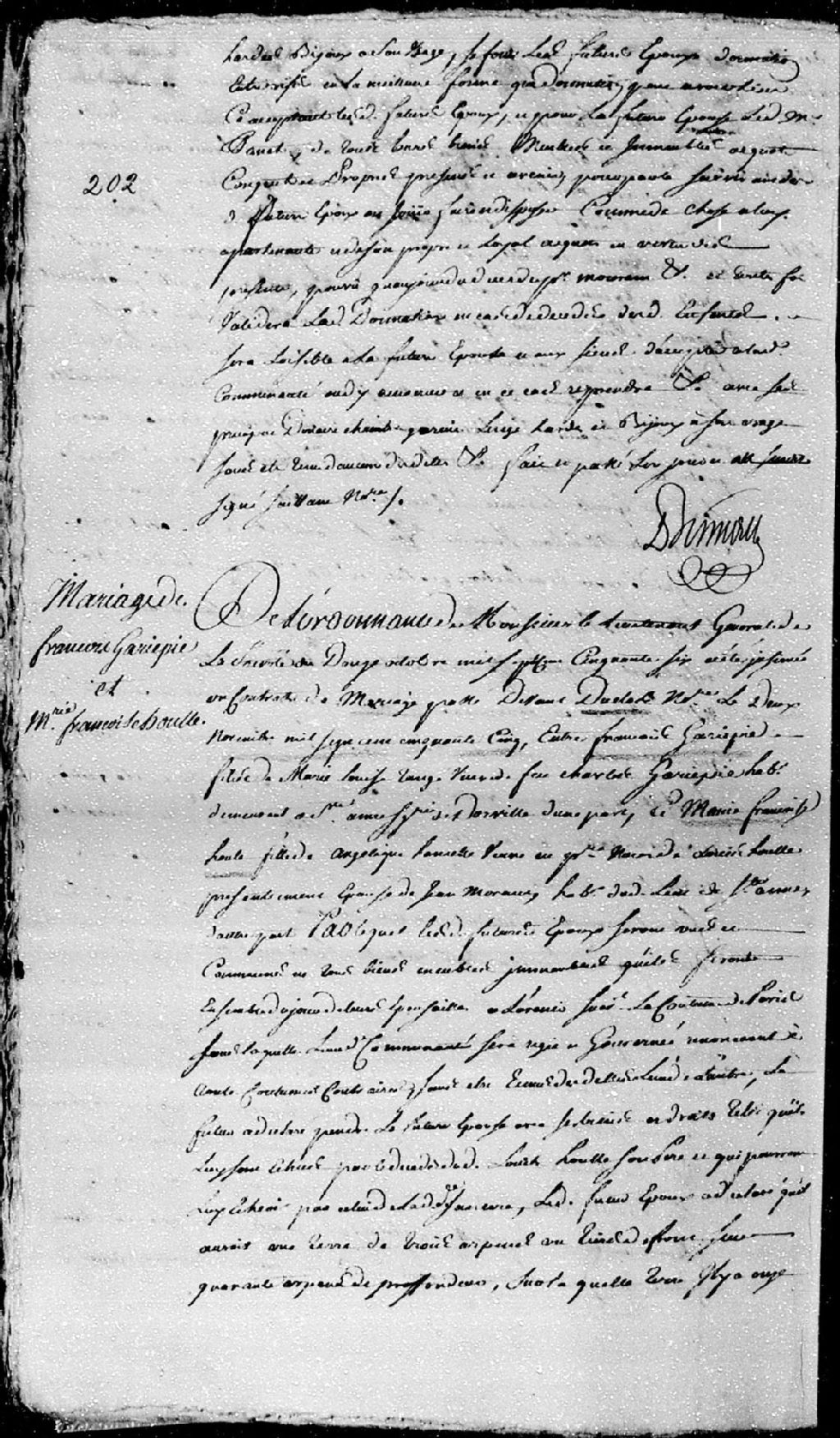 Extrait du contrat de mariage passé pardevant maître Duclos, notaire, entre François Gariepie (Gariépy), fils de feu Charles Gariepie (Gariépy) et de Marie-Louise [Louise-Catherine] Angé (Lefebvre dit Angers), ses père et mère, habitants demeurant à Sainte-Anne; et Marie-Françoise Houle (Houde), fille de défunt Louis Houle (Houde) et d'Angélique Hamelle (Hamel), ses père et mère, 2 novembre 1755 [Document insinué le 12 octobre 1756], Archives nationales à Québec, Fonds Cour supérieure. District judiciaire de Québec. Insinuations, (03Q,CR301,P4125).