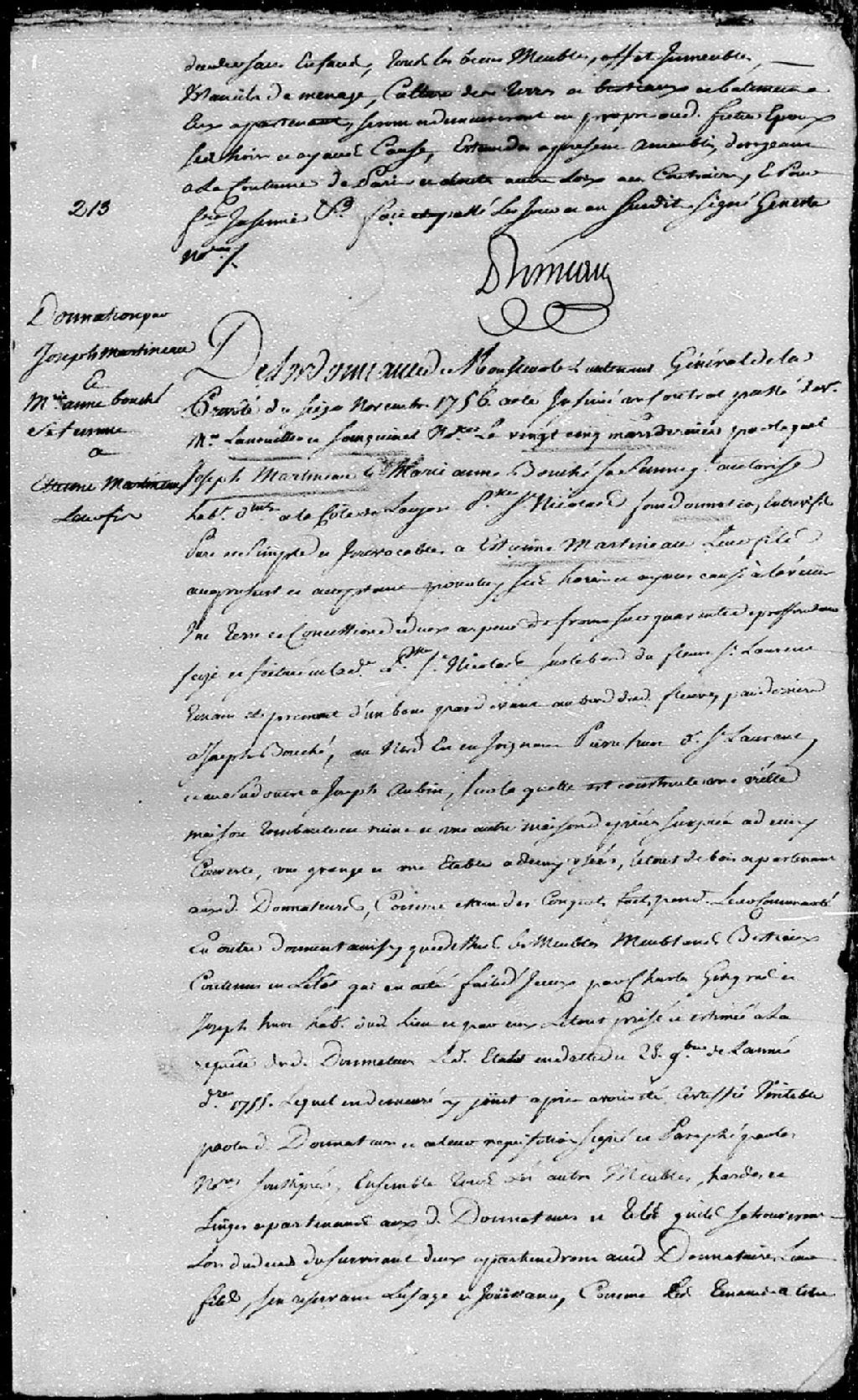 Donation par Joseph Martineau (dit Lormière) et Marie-Anne Bouché (Boucher), mari et femme, habitants demeurant en la côte de Lauzon, paroisse Saint-Nicolas; à Étienne Martineau, leur fils; à savoir une terre et concession sise et située en ladite paroisse de Saint-Nicolas, avec la maison et les bâtiments qui y sont construits, et en outre les meubles, hardes et linges appartenant aux donateurs; la présente donation est passée pardevant maîtres Lanoullier et Sanguinet, notaires