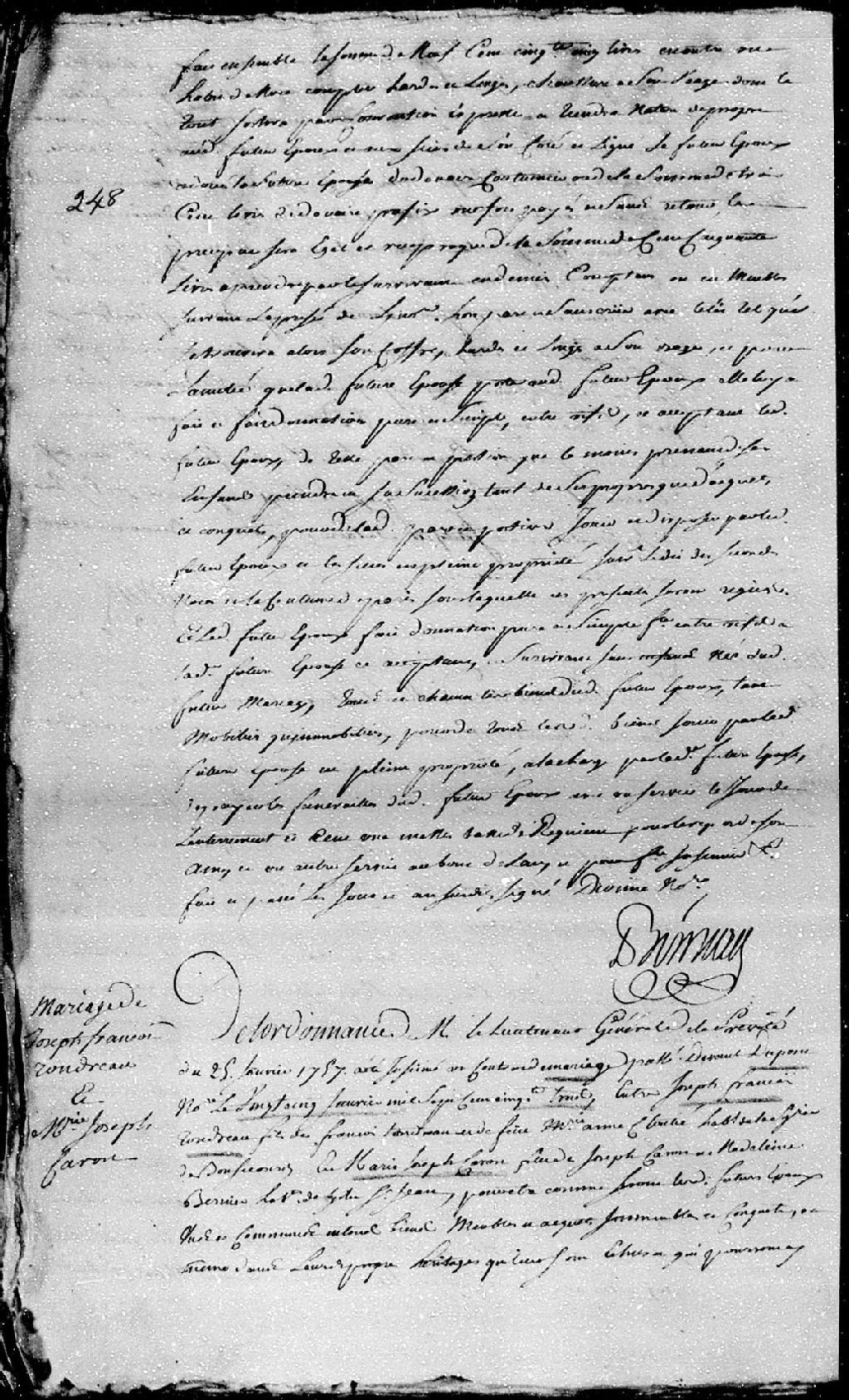 Extrait du contrat de mariage passé pardevant maître Dupont, notaire, entre Joseph-François Tondreau, fils de François Tondreau et de feue Marie-Anne Cloutié (Cloutier), ses père et mère, habitants de la seigneurie de Bonsecours; et Marie-Josèphe Caron, fille de Joseph Caron et de Marie-Madeleine Bernier, ses père et mère, habitants de L'Islet-Saint-Jean