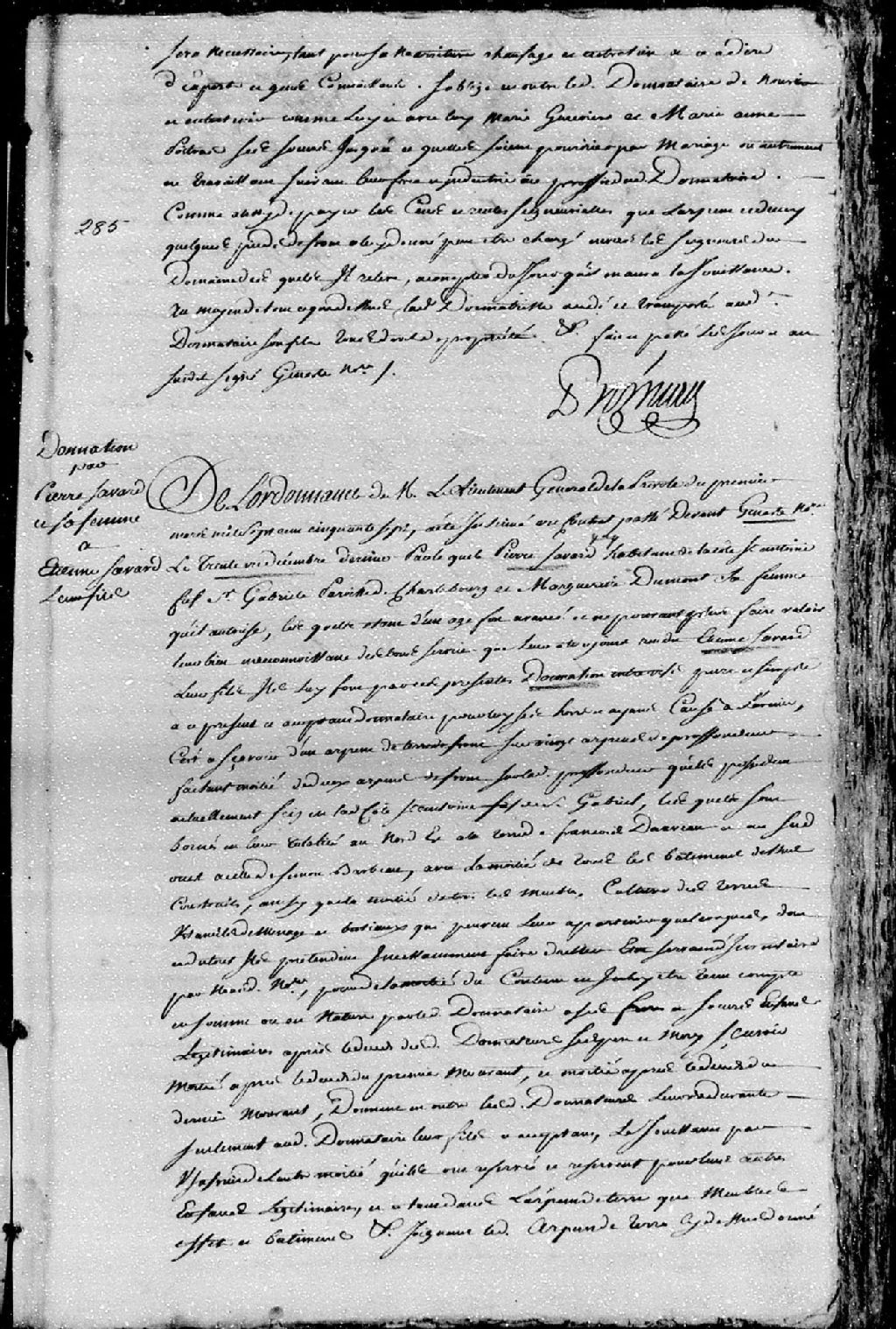 Donation par Pierre Savard, habitant de la côte Saint-Antoine, au fief Saint-Gabriel, paroisse de Charlesbourg, et Louise-Marguerite Dumont, sa femme; à Étienne Savard, leur fils; une terre d'un arpent de front sur vingt arpents de profondeur faisant la moitié d'une terre sise à la côte Saint-Antoine, avec la moitié de tous les meubles, ustensiles de ménage, ustensiles de culture, bestiaux et bâtiments qui y sont construits; la présente donation est passée pardevant maître Geneste, notaire