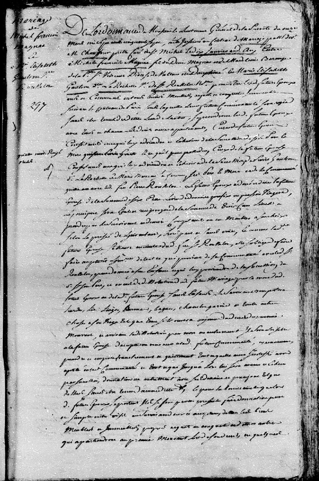 Extrait du contrat de mariage passé sous seing privé en présence du prêtre Chaufour, curé de Saint-Michel, entre Michel-François Magnac, fils de Denis Magnac et de Madeleine Béranger, ses père et mère, de la paroisse Saint-Vincent, diocèse de Valence en Dauphiné; et Marie-Élisabeth Gautron dit LaRochelle, veuve de feu Pierre Rousselot, notaire