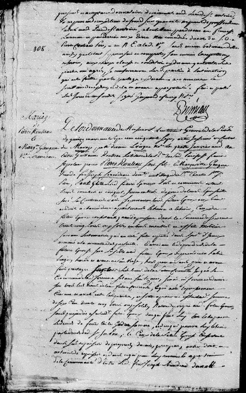 Extrait du contrat de mariage passé pardevant maître Lévesque, notaire, entre Pierre Rouleau, fils de Guillaume Roulleau (Rouleau), habitant de la Rivière-du-Sud, paroisse Saint-François, et de défunte Cécile Godin, ses père et mère; et Marguerite Gangnon (Gagnon), veuve de feu Joseph Loreandeau (Laurendeau), demeurant au village de Sainte-Canelle en la paroisse Saint-Pierre