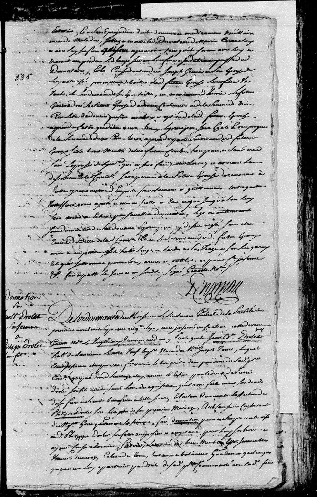 Donation par Jean-Baptiste Drolet, habitant de L'Ancienne-Lorette, veuf en premières noces de défunte Marie-Josèphe Verret; à Philippe Drolet, son fils; à savoir la moitié des biens meubles, effets, immeubles, ustensiles de ménage, culture de terre, bestiaux et bâtiments pouvant appartenir au donateur par son droit de communauté avec feue Marie-Josèphe Verret; la présente donation est passée pardevant maître Geneste, notaire