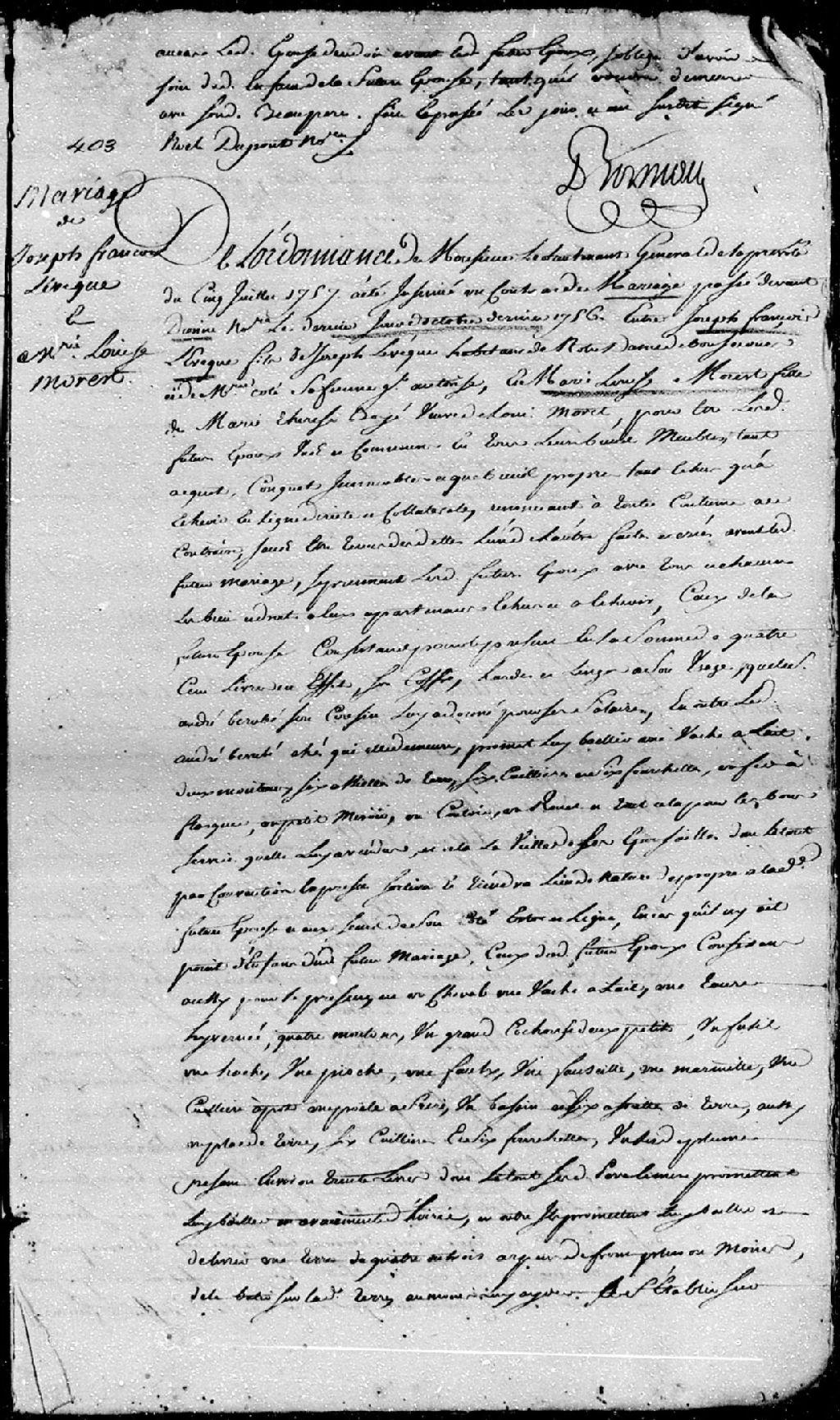 Extrait du contrat de mariage passé pardevant maître Dionne, notaire, entre Joseph-François Léveque (Lévesque), fils de Joseph Léveque (Lévesque), habitant de Notre-Dame-de-Bonsecours, et de Marie Côté, ses père et mère; et Marie-Louise Morest (Maurais), fille de feu Louis Morest (Maurais) et de Marie-Thérèse Boyé (Bois), ses père et mère, 31 octobre 1756 [Document insinué le 5 juillet 1757], Archives nationales à Québec, Fonds Cour supérieure. District judiciaire de Québec. Insinuations, (03Q,CR301,P4264).