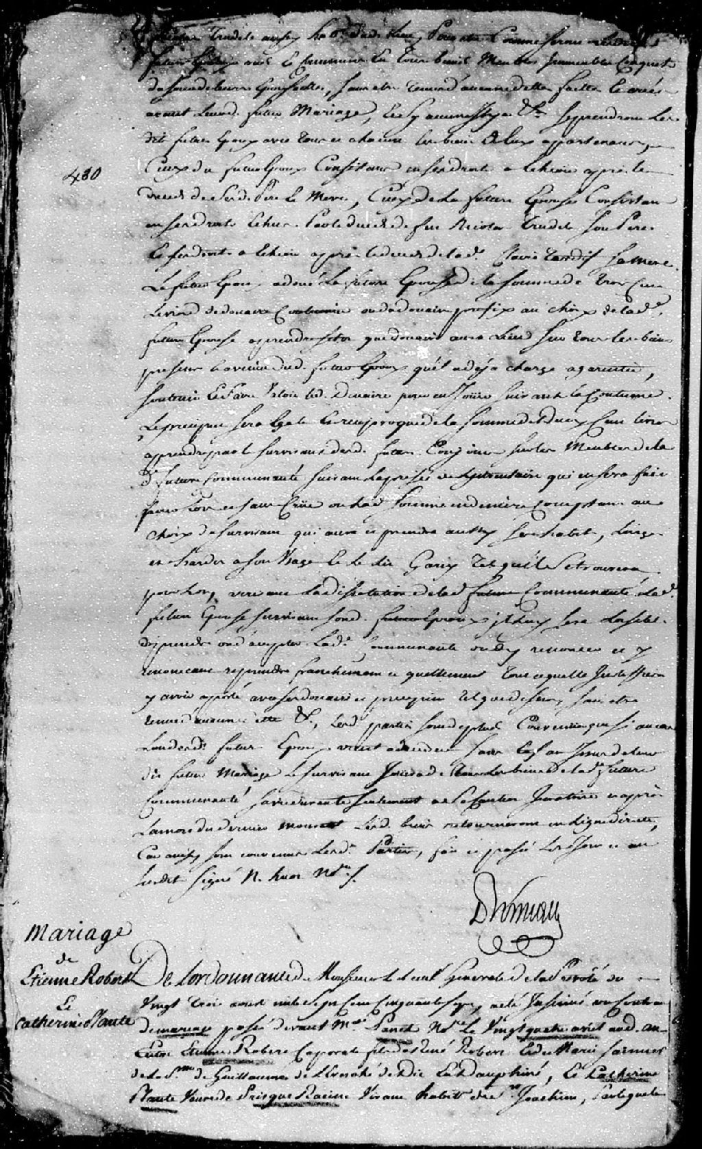 Extrait du contrat de mariage passé pardevant maître Panet, notaire, entre Étienne Robert, caporal, fils de René Robert et de Marie Samuel, ses père et mère, de la paroisse de Saint-Guillaume, évêché de Dié en Dauphiné; et Catherine Plante, veuve de feu Prisque Racine, vivant habitant de Saint-Joachim, 24 avril 1757 [Document insinué le 23 août 1757], Archives nationales à Québec, Fonds Cour supérieure. District judiciaire de Québec. Insinuations, (03Q,CR301,P4286).