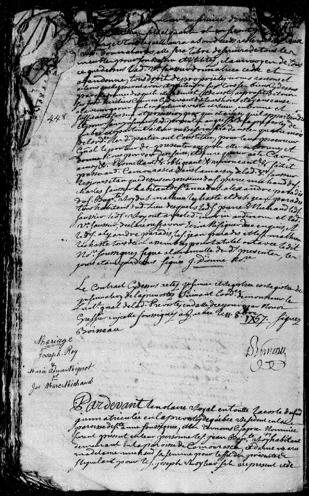 Extrait du contrat de mariage passé pardevant maître Dionne, notaire, entre Joseph Roy, fils de Jean-Baptiste Roy, habitant demeurant en la paroisse de Kamouraska, et Marie-Madeleine Michaud, ses père et mère; et Marie-Anne Mignot (Mignault), veuve de feu Joseph-Marie Richard, demeurant également audit lieu de Kamouraska, 12 septembre 1757 [Document insinué le 11 octobre 1757], Archives nationales à Québec, Fonds Cour supérieure. District judiciaire de Québec. Insinuations, (03Q,CR301,P4298).