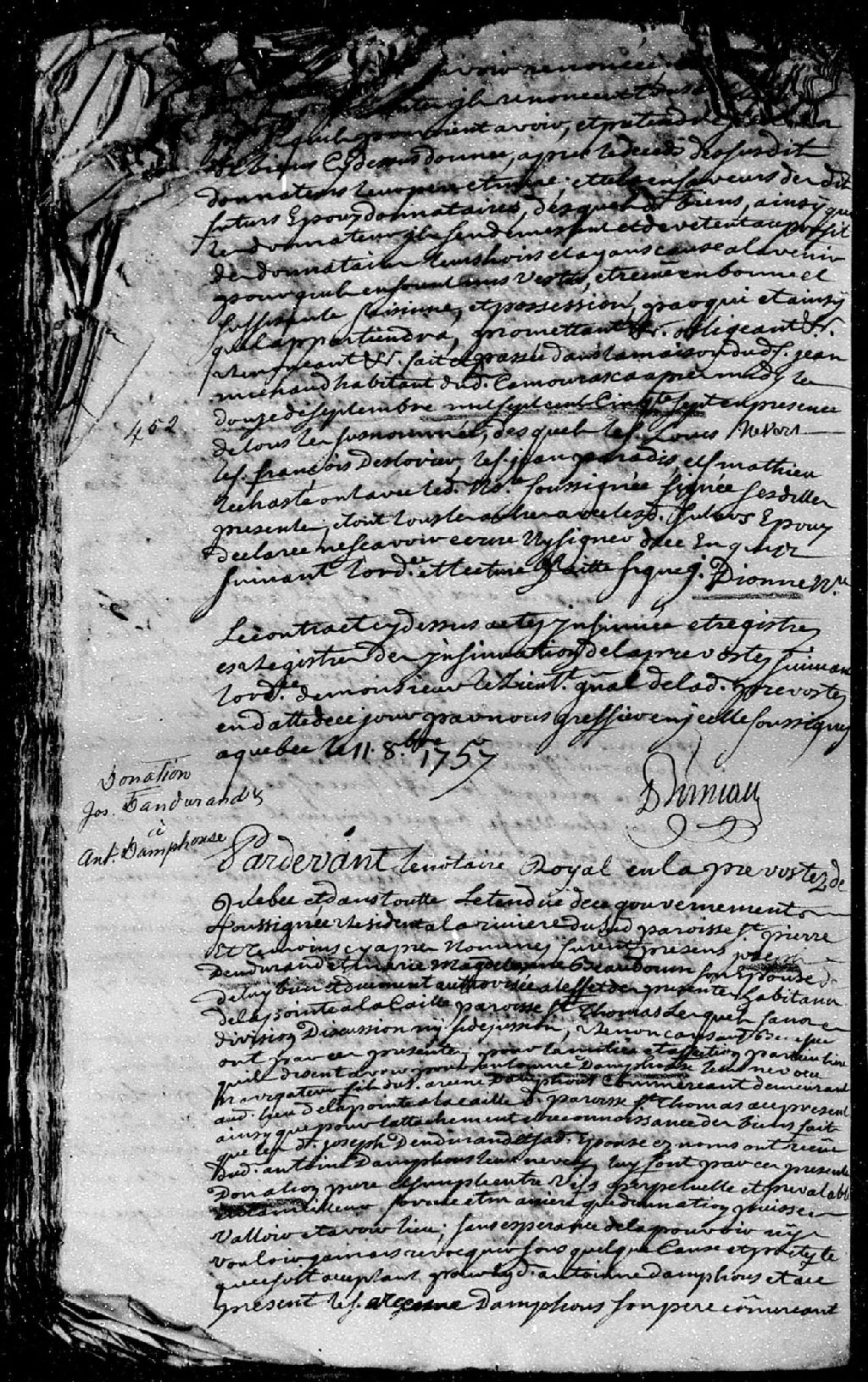 Donation d'une portion de terre située à la paroisse Saint-Thomas; par Joseph-François Dandurand et Marie-Madeleine Beaudouin (Beaudoin), mari et femme, habitants de la Pointe-à-la-Caille, paroisse Saint-Thomas; à Antoine Damphous, leur neveu, navigateur, fils de Jean-Anselme Damphous, commerçant demeurant également à la Pointe-à-la-Caille; la présente donation est passée pardevant maître Lévesque, notaire, 8 août 1755 [Document insinué le 11 octobre 1757], Archives nationales à Québec, Fonds Cour supérieure. District judiciaire de Québec. Insinuations, (03Q,CR301,P4299).