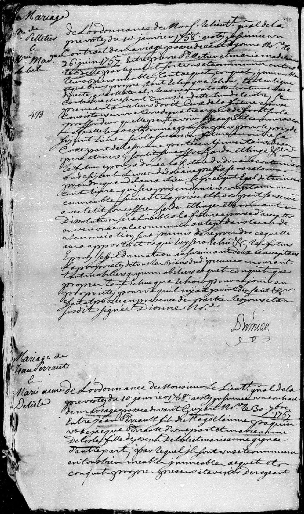 Extrait du contrat de mariage passé pardevant maître Guyart, notaire, entre Jean Perrault, fils de feu Jacques Perrault et de Madeleine Paquin, ses père et mère; et Marie-Anne Delisle, fille de Joseph Delisle et de Marie-Anne Gignac, ses père et mère, 30 septembre 1757 [Document insinué le 10 janvier 1758], Archives nationales à Québec, Fonds Cour supérieure. District judiciaire de Québec. Insinuations, (03Q,CR301,P4320).