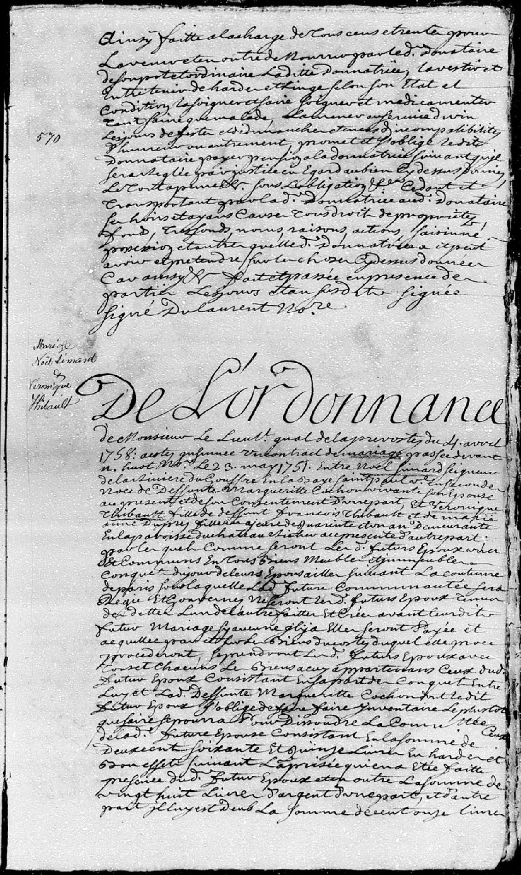 Extrait du contrat de mariage passé pardevant maître Huot, notaire, entre Noël Simard, seigneur de la Rivière-du-Gouffre à Baie-Saint-Paul, veuf en secondes noces de défunte Marguerite Cochon (Cauchon); et Véronique Thibault, âgée de 41 ans, fille majeure de défunt François Thibault et de Marie-Anne Dupré, ses père et mère, demeurant en la paroisse du Château-Richer, 23 mai 1751 [Document insinué le 4 avril 1758], Archives nationales à Québec, Fonds Cour supérieure. District judiciaire de Québec. Insinuations, (03Q,CR301,P4367).