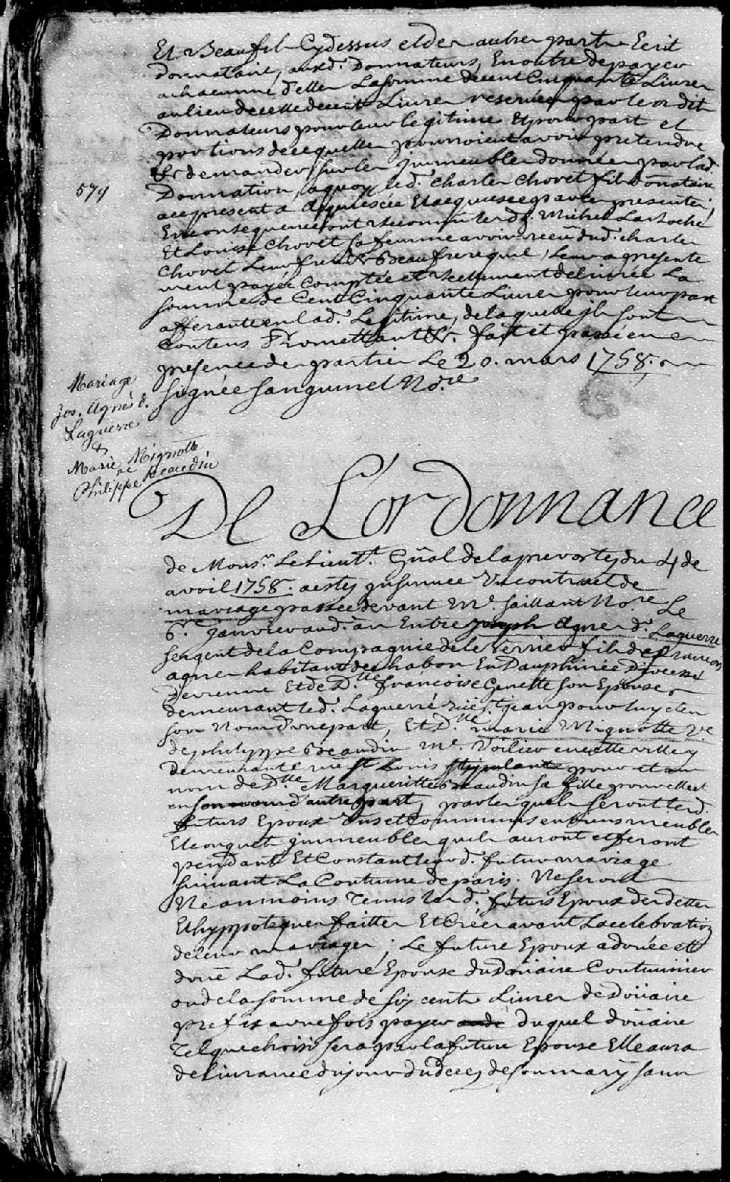 Extrait du contrat de mariage passé pardevant maître Saillant, notaire, entre Joseph Agnès dit Laguerre, sergent de la Compagnie de Le Verrier, demeurant rue Saint-Jean, fils de François Agnès, habitant du Châbons en Dauphiné, diocèse de Vienne, et de Françoise Genette (Ginet), ses père et mère; et Marguerite Beaudin, fille de feu Philippe Beaudin, maître voilier en la ville de Québec, stipulant par Marie Mignotte, sa mère, demeurant rue Saint-Louis