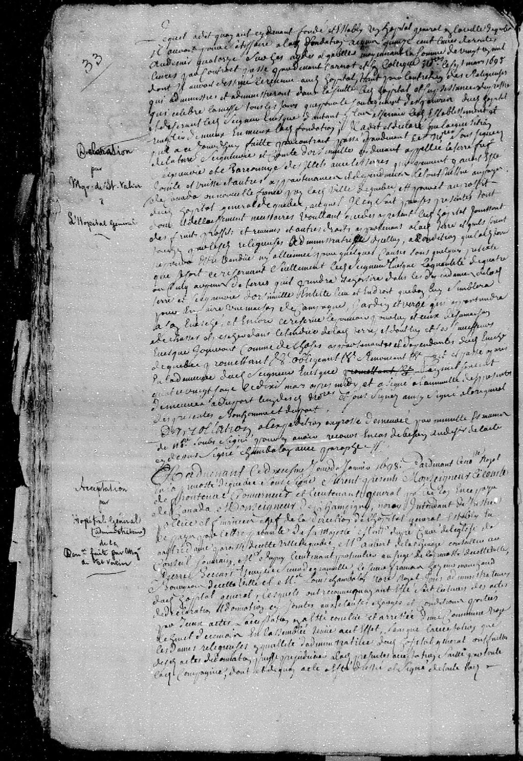 Acceptation par le comte de Frontenac, gouverneur et lieutenant général pour le roi en Nouvelle-France; Monseigneur de Champigny, intendant de la Nouvelle-France et chef de la direction de l'Hôpital-Général de Québec; d'une donation faite par Monseigneur Jean-Baptiste de Lacroix de Saint-Vallier..., 8 janvier 1698 [Document insinué le 8 janvier 1698], Archives nationales à Québec, Fonds Cour supérieure. District judiciaire de Québec. Insinuations, (03Q,CR301,P439).