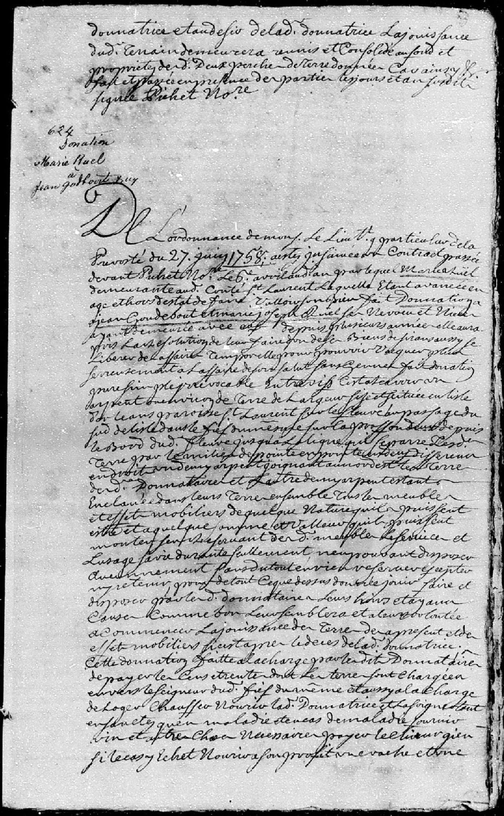 Donation par Marie Ruel, demeurant au comté Saint-Laurent (île d'Orléans); à Jean Gaudebout (Godbout) et Marie-Josèphe Ruel, ses neveu et nièce, demeurant avec la donatrice depuis plusieurs années; à savoir une terre sise et située en l'île d'Orléans, paroisse Saint-Laurent, avec tous les meubles et effets mobiliers pouvant appartenir à la donatrice; la présente donation est passée pardevant maître Pichet, notaire