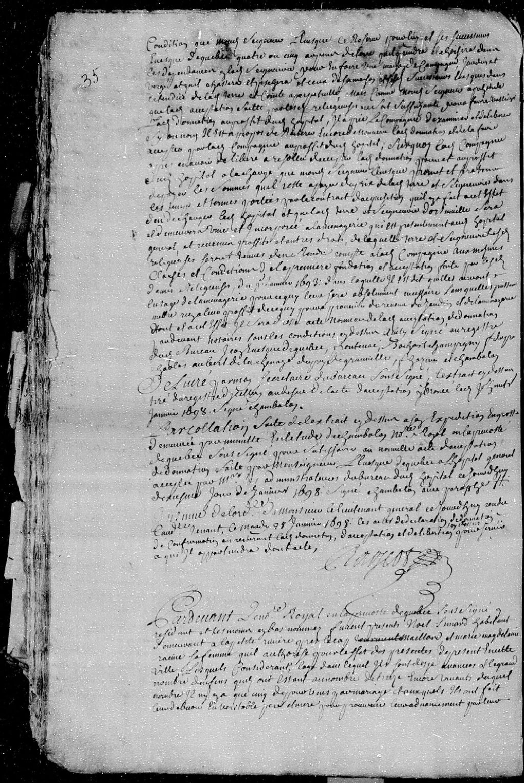 Donation d'une terre et habitation sise en la côte et seigneurie de Beaupré, paroisse Sainte-Anne, par Noël Simard, habitant de la Petite-Rivière, près du Cap Maillard, et Marie-Madeleine Racine, son épouse; à Joseph et Augustin Simard, leurs enfants mineurs de 22 et 24 ans; ladite donation est passée pardevant maître Chambalon, notaire royal en la Prévôté de Québec, en présence du sieur Dupont, conseiller au Conseil souverain, et de François Aubert, témoins