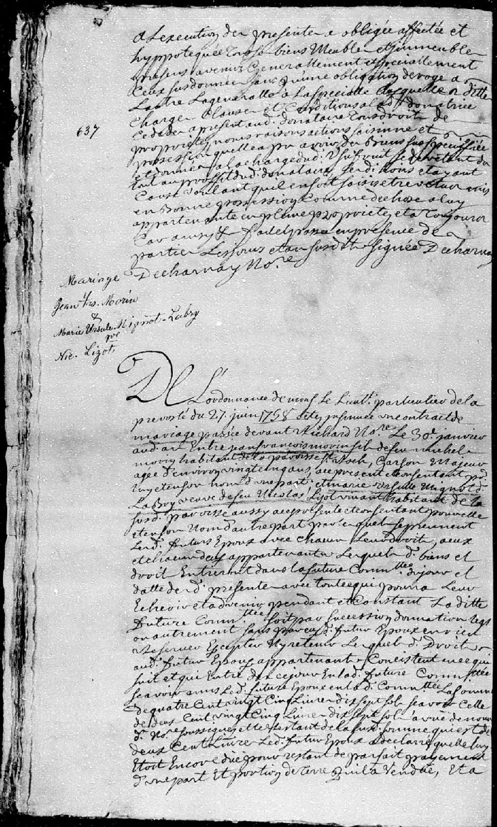 Extrait du contrat de mariage passé pardevant maître Richard, notaire, entre Jean-François Morin, garçon majeur âgé d'environ 20 ans, fils de feu Michel Morin, habitant de la paroisse Saint-Roch; et Marie-Ursule Mignot (Mignault) dit Labrie, veuve de feu Nicolas Lizot, vivant habitant de la susdite paroisse, 30 janvier 1758 [Document insinué le 27 juin 1758], Archives nationales à Québec, Fonds Cour supérieure. District judiciaire de Québec. Insinuations, (03Q,CR301,P4405).