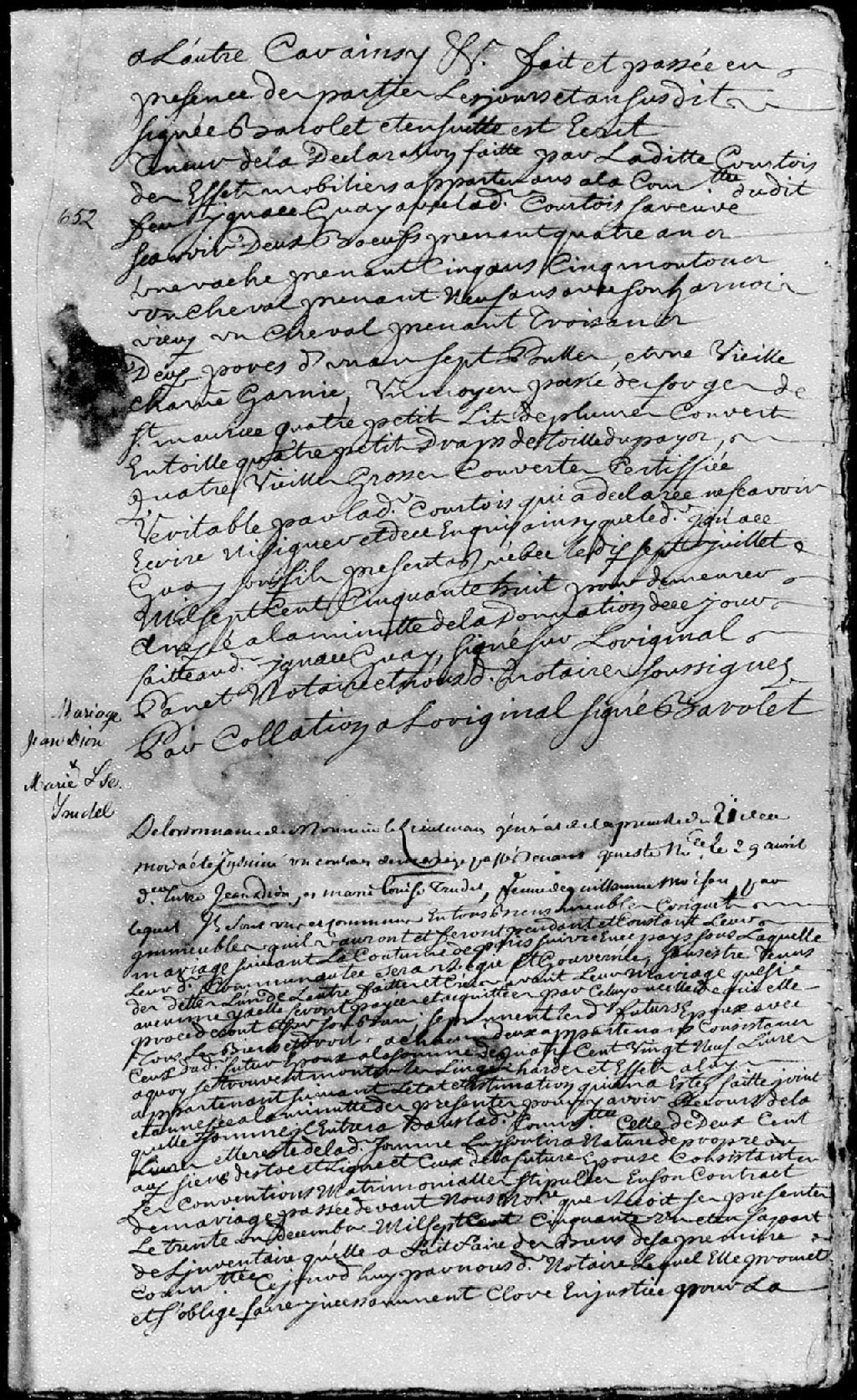 Extrait du contrat de mariage passé pardevant maître Geneste, notaire, entre Jean Dion (Guyon); et Marie-Louise Trudel, veuve de feu Guillaume Moisan, 29 avril 1758 [Document insinué le 21 juillet 1758], Archives nationales à Québec, Fonds Cour supérieure. District judiciaire de Québec. Insinuations, (03Q,CR301,P4414).