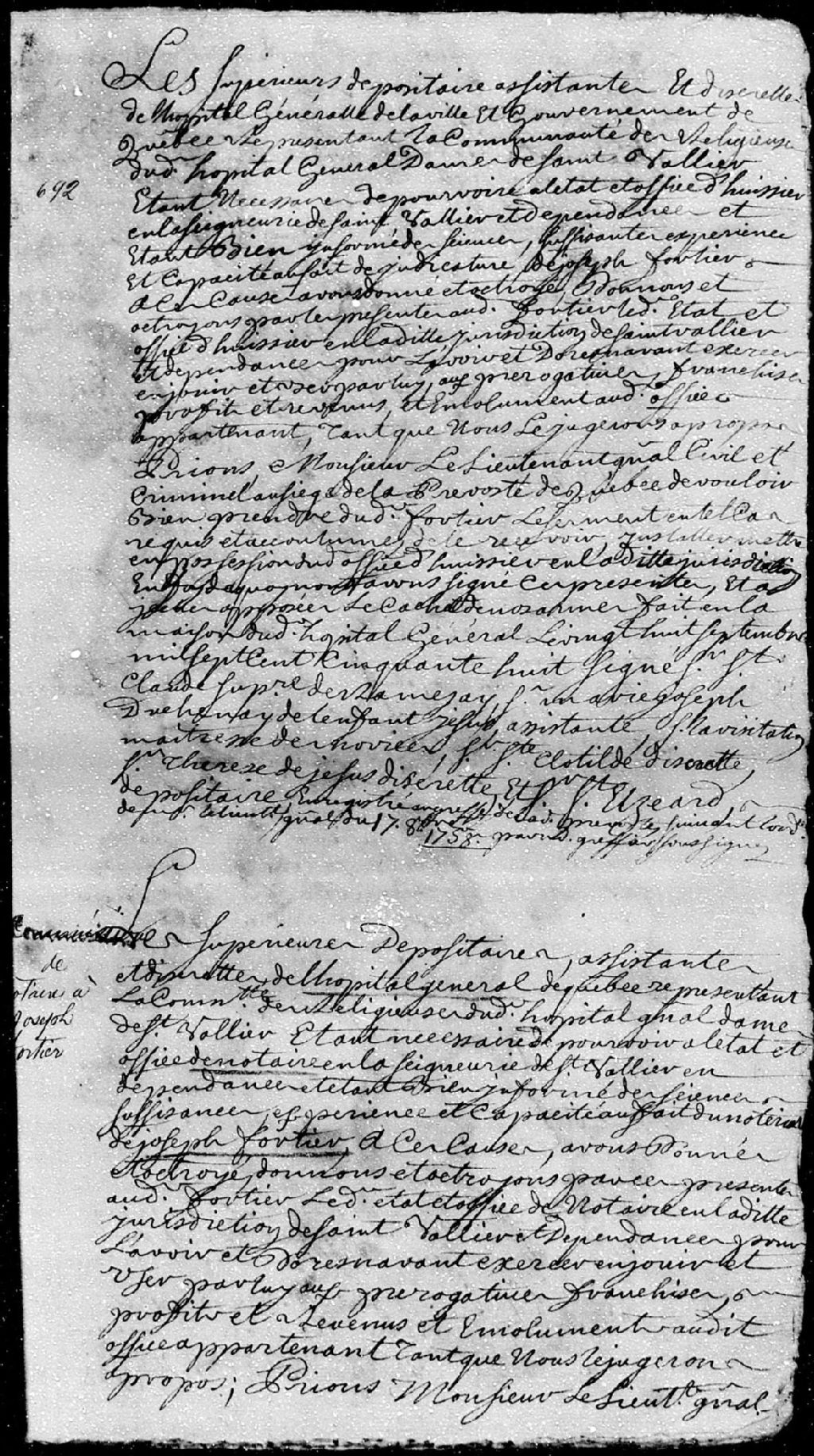 Commission de notaire en la seigneurie de Saint-Vallier accordée à Joseph Fortier, par les Supérieures Dépositaires de l'Hôpital général de Québec, 28 septembre 1758 [Document insinué le 17 octobre 1758], Archives nationales à Québec, Fonds Cour supérieure. District judiciaire de Québec. Insinuations, (03Q,CR301,P4445).