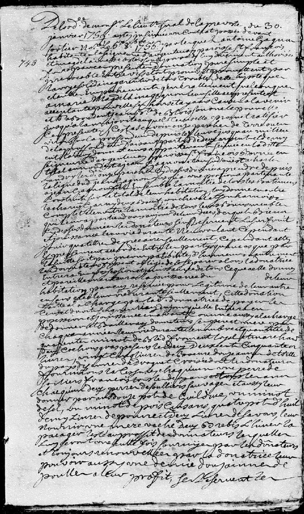 Donation d'une terre sise en la seigneurie d'Argentenay, paroisse Saint-François, avec la moitié des bâtiments qui y sont construits, et divers meubles et bestiaux; par Antoine Gagnon, habitant dudit lieu, et Madeleine Deblois, son épouse; à Marie-Madeleine Gagnon, leur fille, acceptant par Jean-Baptiste Deblois, son oncle; la présente donation est passée pardevant maître Fortier, notaire