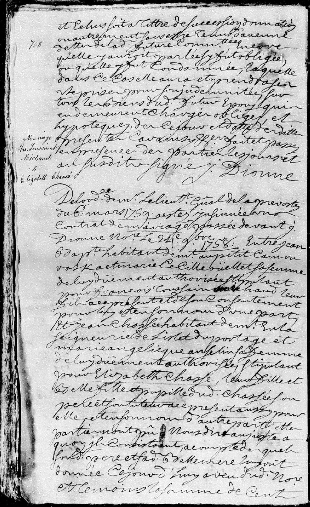 Extrait du contrat de mariage passé pardevant maître Dionne, notaire, entre François-Toussaint Michaud, fils de Jean-Baptiste Michaud, habitant demeurant au petit Kamouraska, et Marie-Cécile Ouellet, ses père et mère; et Élisabeth Chassé, fille de Jean Chassé, habitant demeurant en la seigneurie de L'Islet-du-Portage, et de Marie-Angélique Asselin, ses père et mère, 24 novembre 1758 [Document insinué le 6 mars 1759], Archives nationales à Québec, Fonds Cour supérieure. District judiciaire de Québec. Insinuations, (03Q,CR301,P4490).