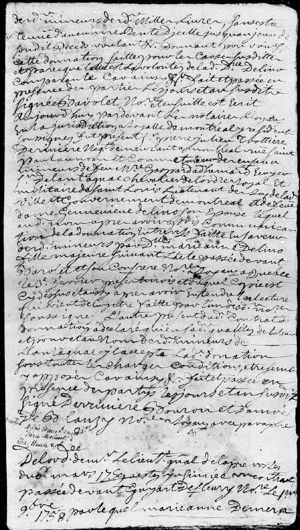 Donation par Marie-Anne Demers, veuve en premières noces de feu Pierre Morisset; à Charles Houlle (Houde dit Desrochers), Charles Bergeron et Augustin Houlle (Houde dit Desrochers), ses enfants et gendre; à savoir tous et chacun de ses biens meubles et immeubles; la présente donation est passée pardevant maître Guyart de Fleury, notaire, 1er novembre 1758 [Document insinué le 6 mars 1759], Archives nationales à Québec, Fonds Cour supérieure. District judiciaire de Québec. Insinuations, (03Q,CR301,P4496).