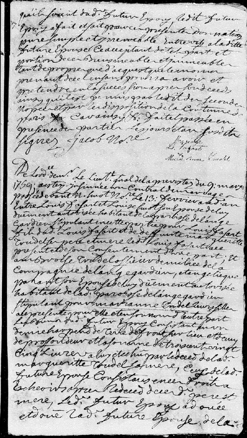 Extrait du contrat de mariage passé pardevant maître Huot, notaire, entre Louis Fafart (Fafard), fils de Louis Fafart (Fafard), habitant de la paroisse de L'Ange-Gardien, époux en secondes noces de Louise Huot, et de défunte Marguerite Trudel, ses père et mère, d'une part; et Marie-Anne Trudel, fille d'Ambroise Trudel, officier de milice de la compagnie de L'Ange-Gardien, et d'Angélique Parant (Parent), ses père et mère, habitants de la susdite paroisse, 13 février 1759 [Document insinué le 9 mars 1759], Archives nationales à Québec, Fonds Cour supérieure. District judiciaire de Québec. Insinuations, (03Q,CR301,P4503).
